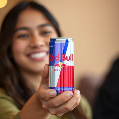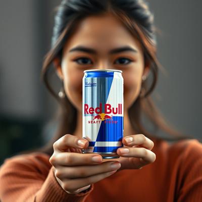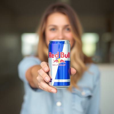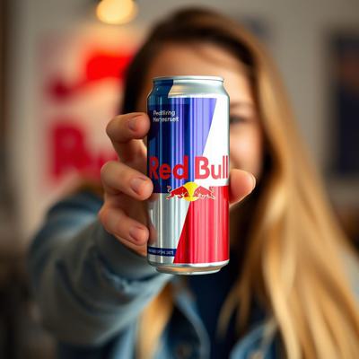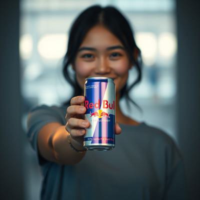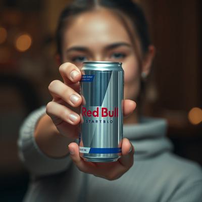 довольная девушка преподносит банку с Redbull прямо в кадр ,банка освещена идеально ,фон мягко расфокусирован