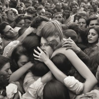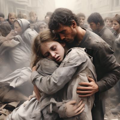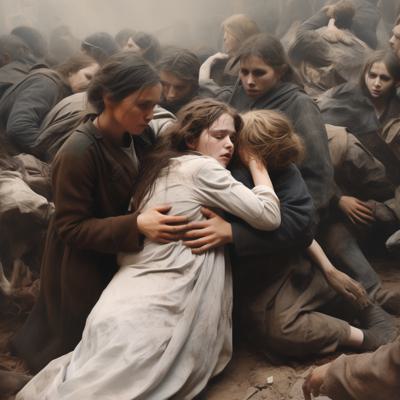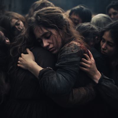 ужасающая картина девушки которая обнимает разорванное тело своего мужа а вокруг них собралась толпа,