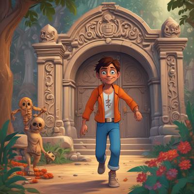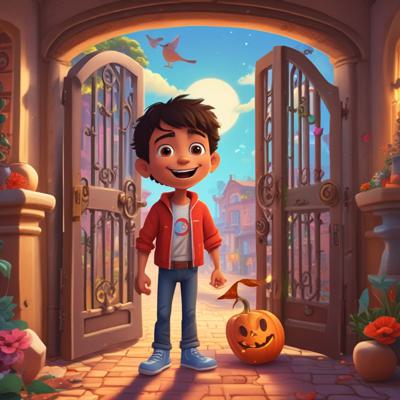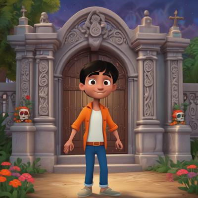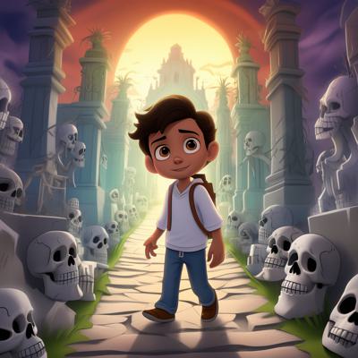 Сгенерируй картинку из мультикаб ль тайна Коко .ЗАГРОБНЫЙ МИР ОТКРЫЛ СВОИ ВРАТА! ЮНЫЙ МИГЕЛЬ ПРОПАЛ БЕЗ ВЕСТИ!мальчик был замечен направляющимся к древнему семейному склепу в День Мёртвых.
