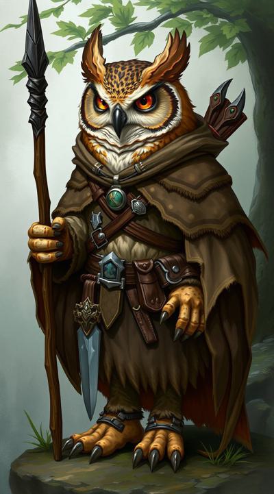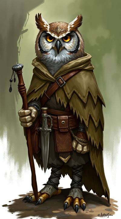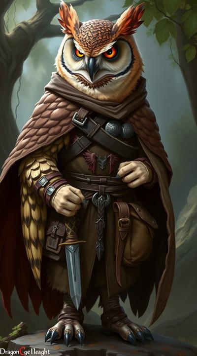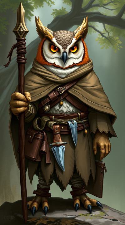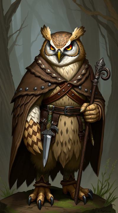 картинка в стиле dragon age, на ней должен быть изображен совлин(антропоморфная сова)-друид из вселенной DnD, в друидской накидке поверх кожаного доспеха с посохом в лапах, на поясе кинжал, через плечо сумка . Фон должен быть связан с природой