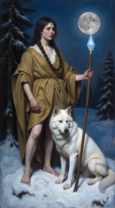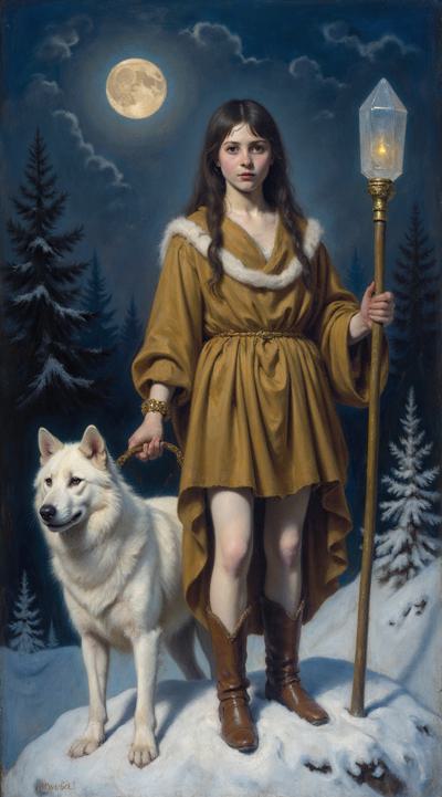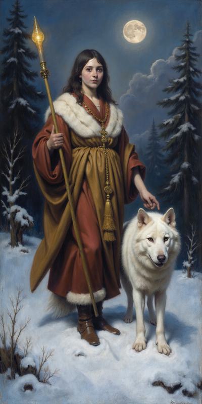 Девушка в индейском зимнем наряде стоит ночью на заснеженном поле, в левой руке посох с магическим кристаллом, у правой ноги призрачный светящийся волк, у правой живой белый волк, на заднем плане темный зимний хвойный лес, в небе светит луна, она слева сверху. Девушка стоит корпусом вперед, но лицо смотрит слегка вбок направо со стороны зрителя
