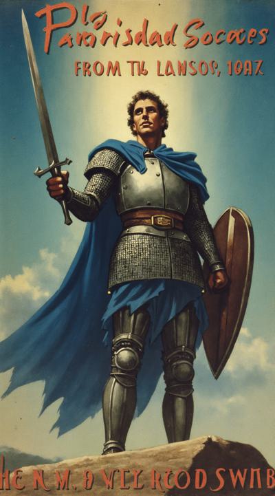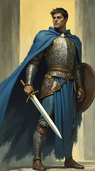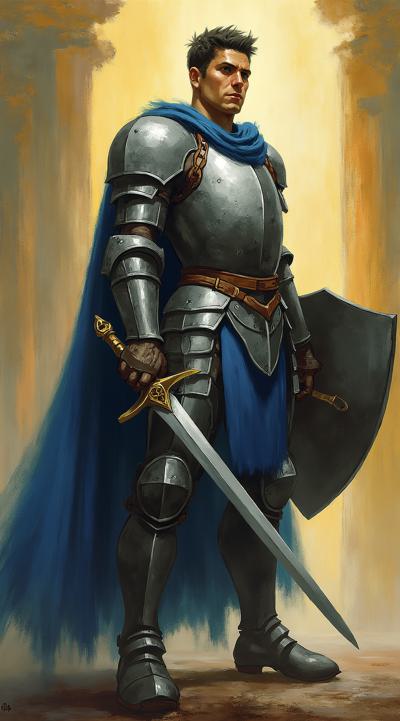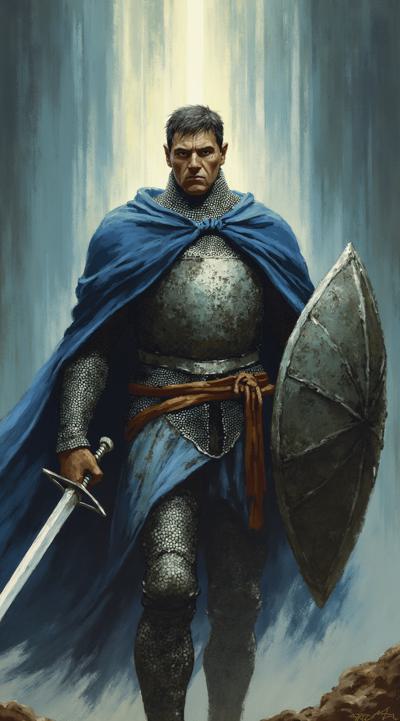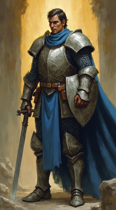 картинка в стиле dragon age, на ней должен быть изображен человек-паладин из вселенной DnD, последователь бога Тира, в кольчужном доспехе, без шлема, в синем плаще. Лицо анфас, в правой руке меч, в левой щит, светлая кожа, темные волосы. Фон должен быть связан со святой магией.