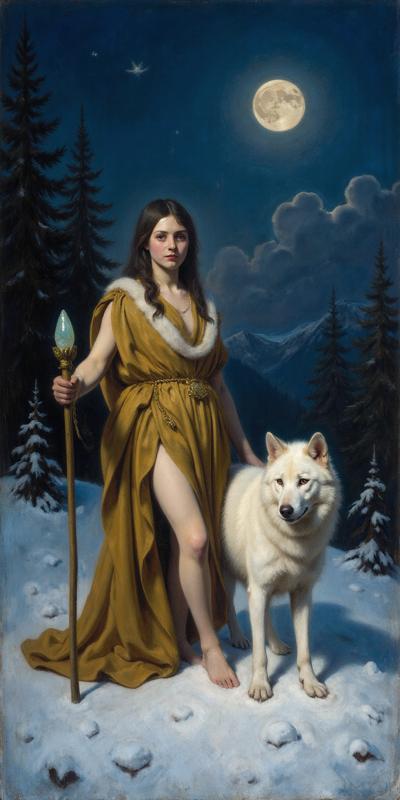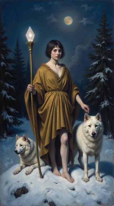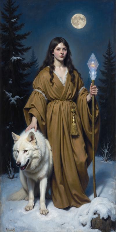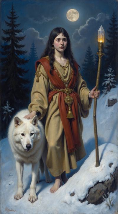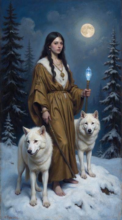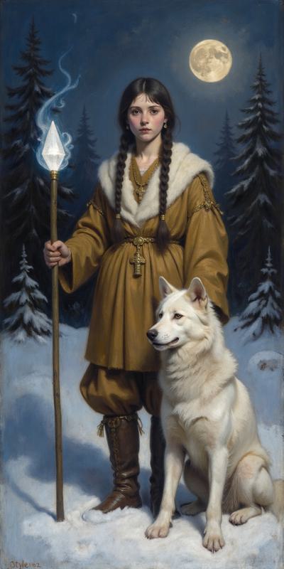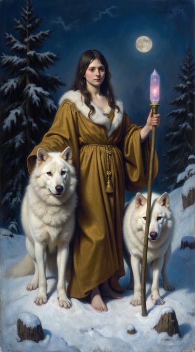 Девушка в индейском зимнем наряде стоит ночью на заснеженном поле, в правой руке посох с магическим кристаллом, у правой ноги призрачный светящийся волк, у левой живой белый волк, на заднем плане темный зимний хвойный лес, в небе светит луна, она слева сверху. Девушка стоит корпусом вперед, но лицо смотрит слегка вбок направо со стороны зрителя