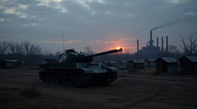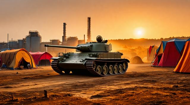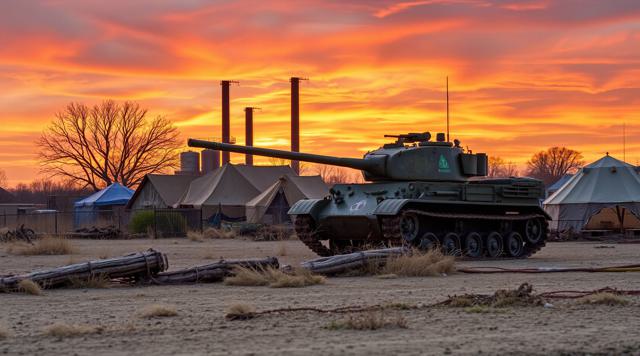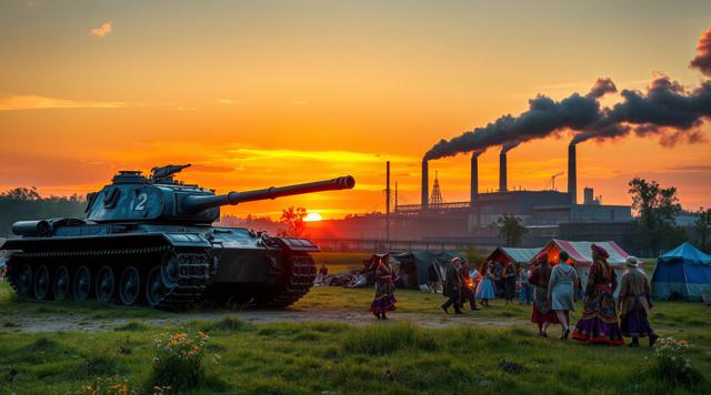 Танк посреди цыганского табора рядом с заводом на закате