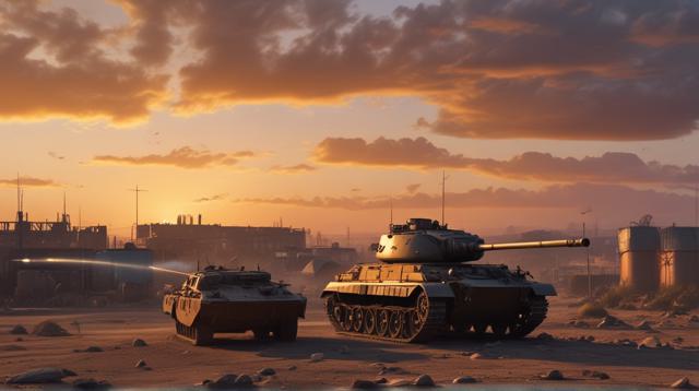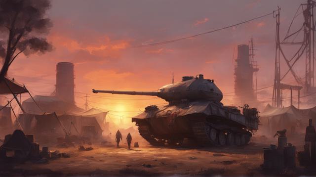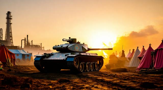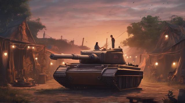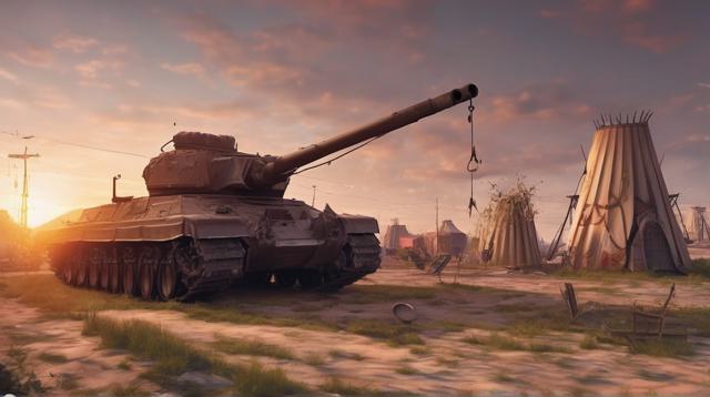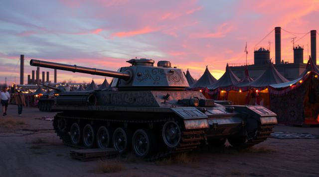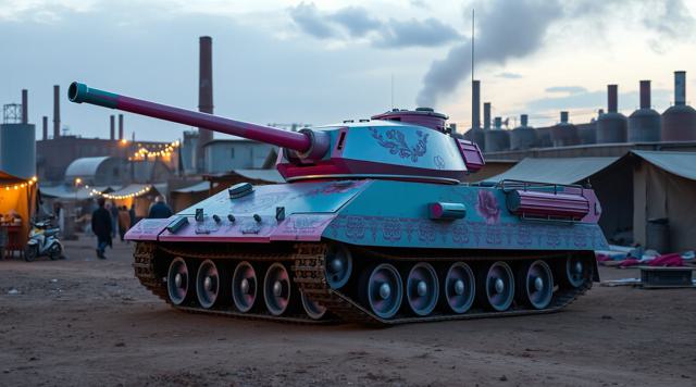 Танк посреди цыганского табора рядом с заводом на закате, танк сделать красивее, в цыганском стиле и более женственным