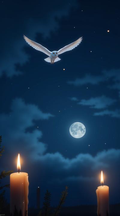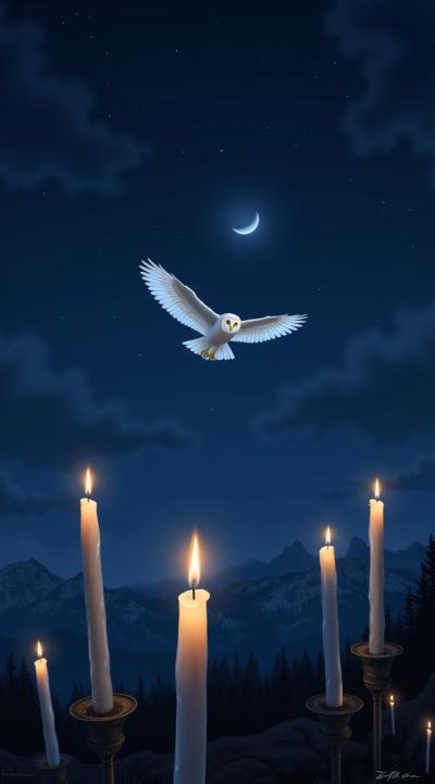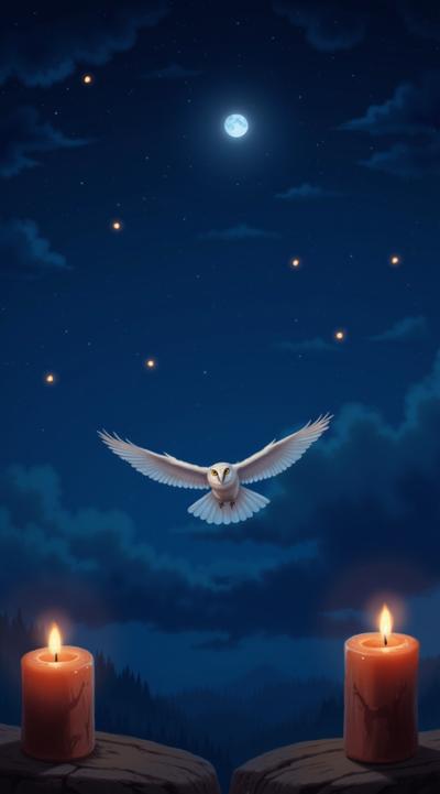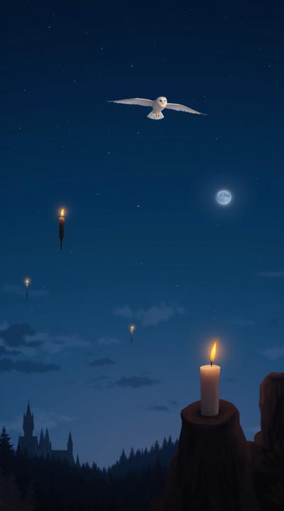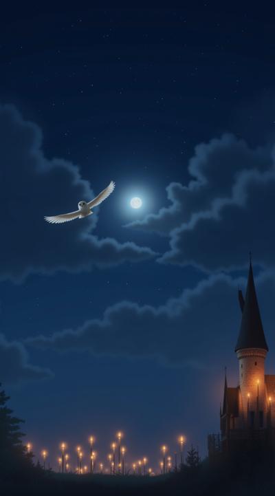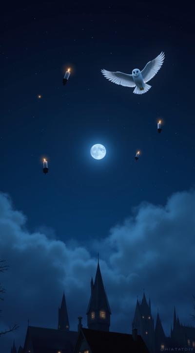 хогвардс, ночное небо, в темно синем небе маленькая луна, летят зажженые свечи в небе, в небе вверху маленькая белая сова летит прямо в кадр, прямой зрительный контакт, крылья совы по горизонту horizontal в небе, magic, волшебство