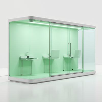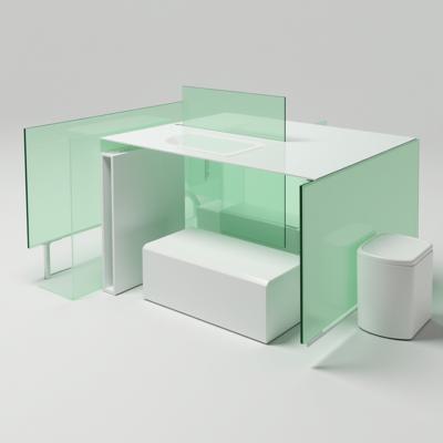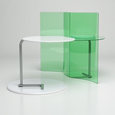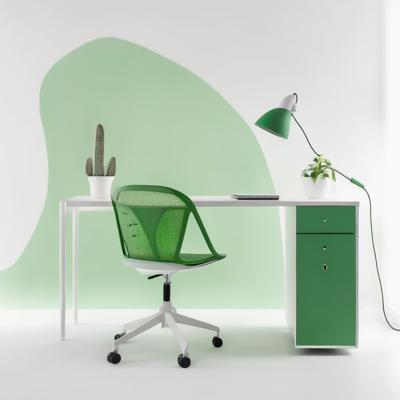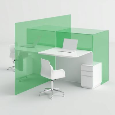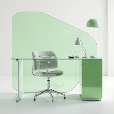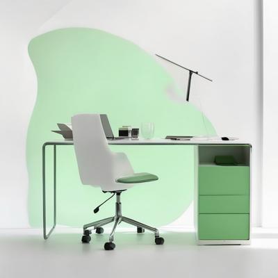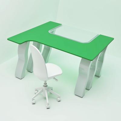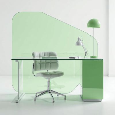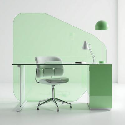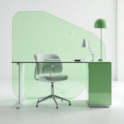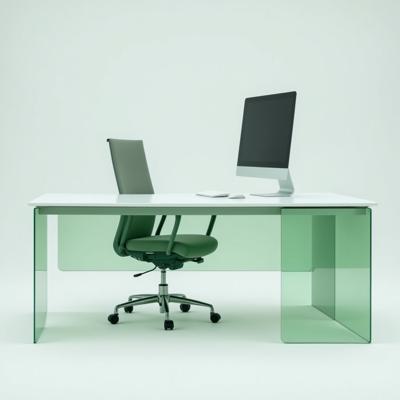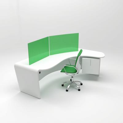 офисное рабочее место. Белый глянцевый пластик, зеленое прозрачное стекло, серебристый металл,
