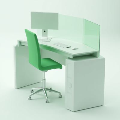 офисное рабочее место: стол, стул, компьютер. Белый глянцевый пластик, зеленое прозрачное стекло, серебристый металл,