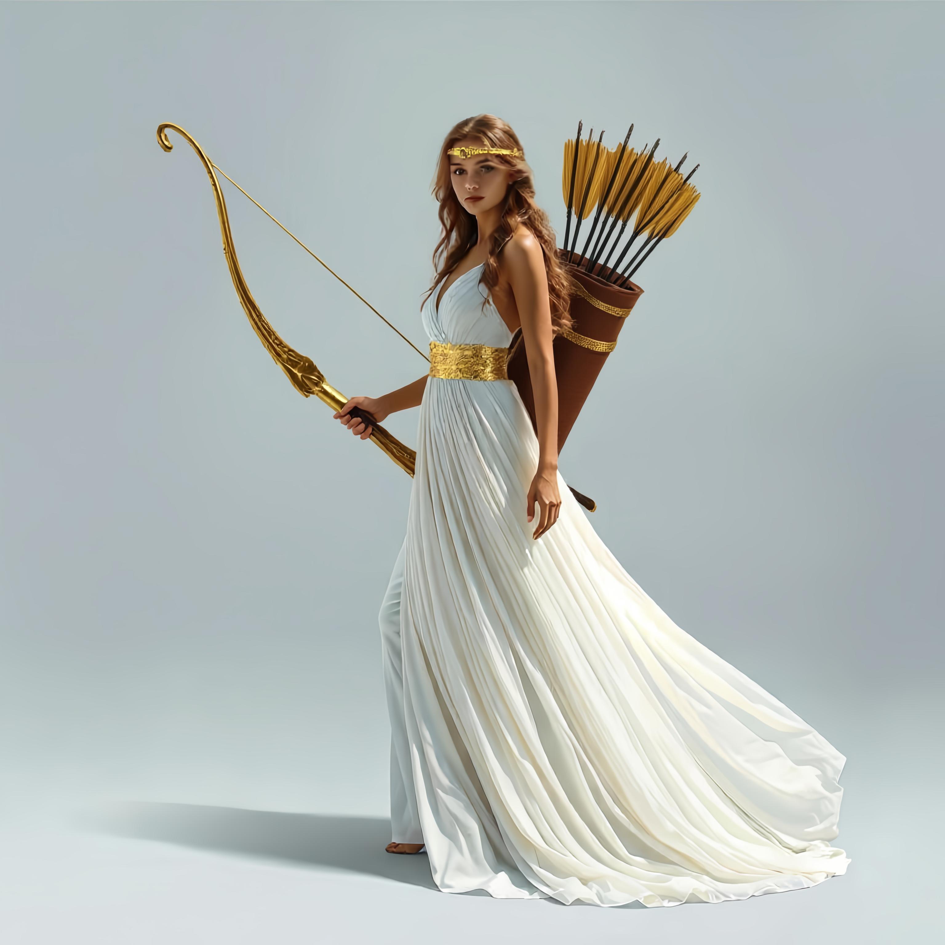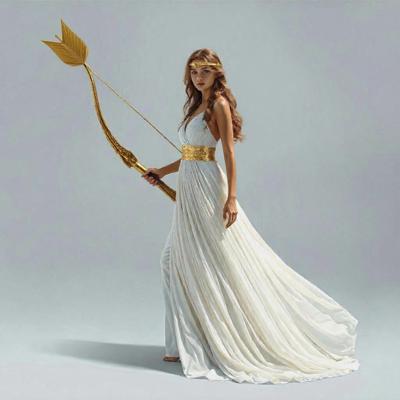 Дорисовать на спине колчан со стрелами [Уточнение для #6198567 'в руке держит золотой лук со стрелой [Уточнение для #6198566 'сделать тонкий золотой шелковый пояс. Надеть на голову золотой тонкий ободок. [Качество x3 [Уточнение для #6198510 'длинное белое платье похожее на платье Дианы-охотницы ]']]']'
