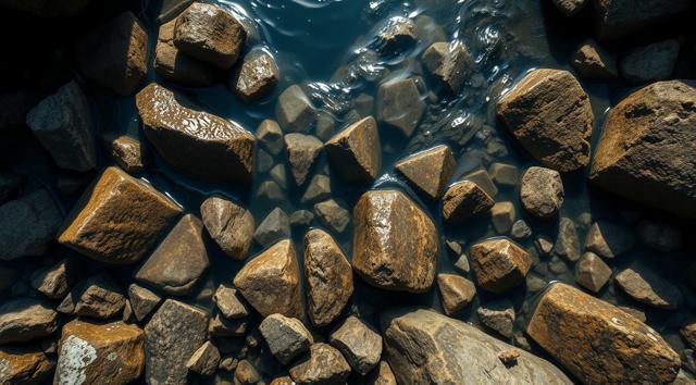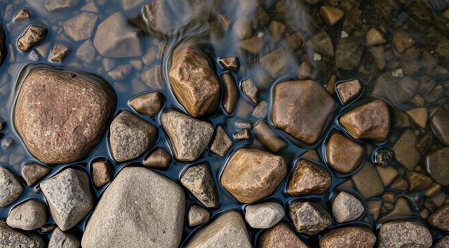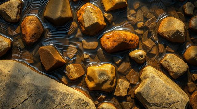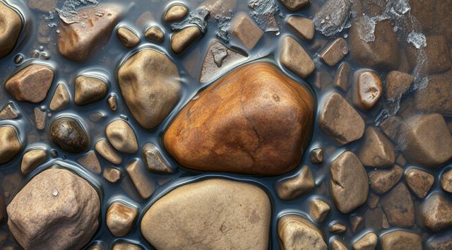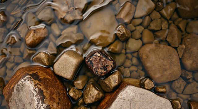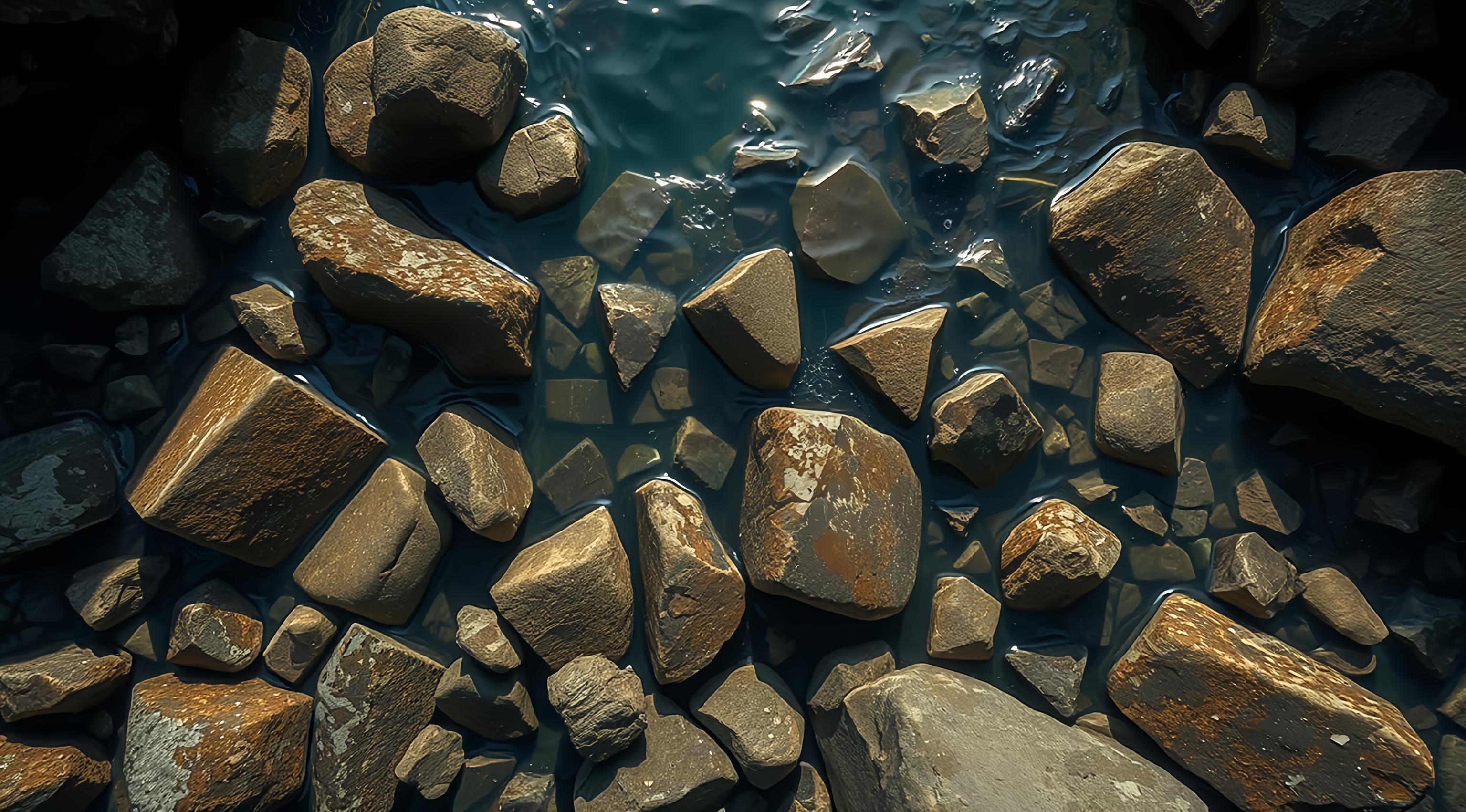 Камни под водой ручья, вид сверху, крупный план, [Улучшение крупных деталей ]