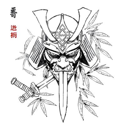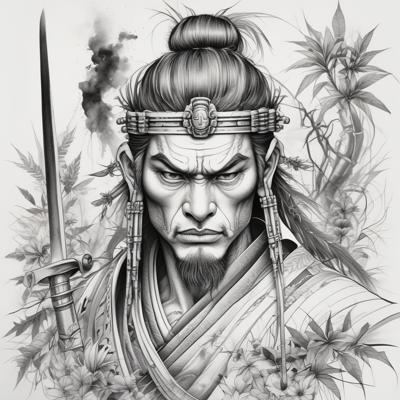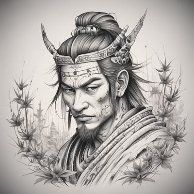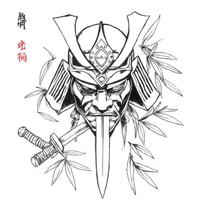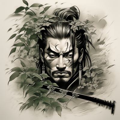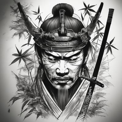 Эскиз тату в китайском стиле , Лицо Самурая с мечом , Вокруг листья бамбука, Рисунок черно-белый,