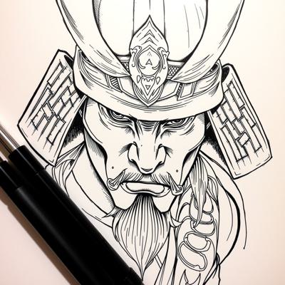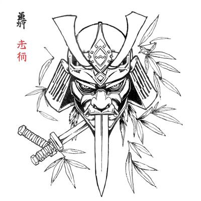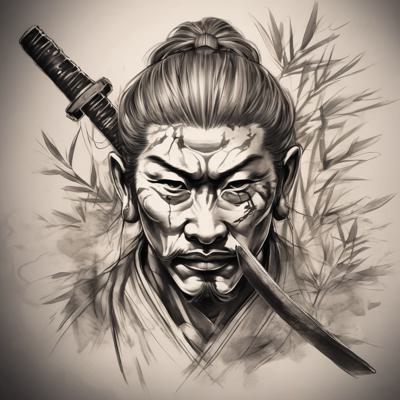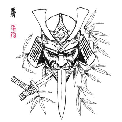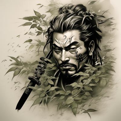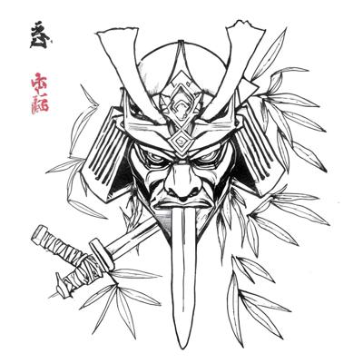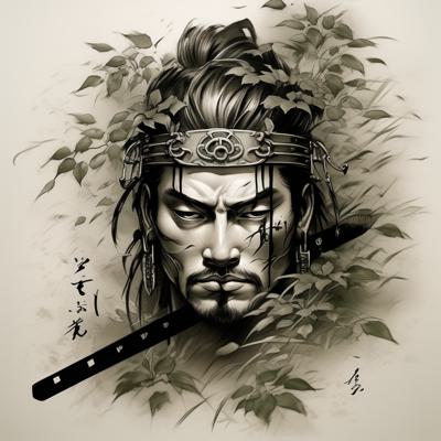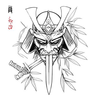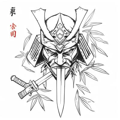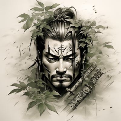 Эскиз тату в китайском стиле , Лицо Самурая с мечом , Вокруг листья бамбука
