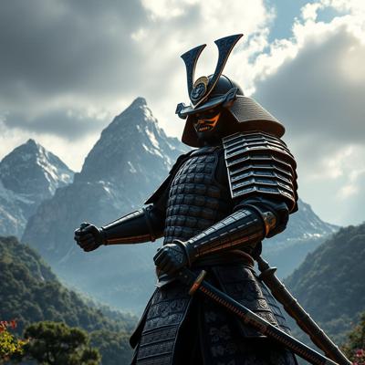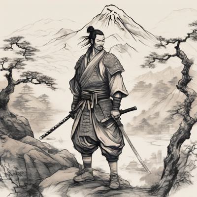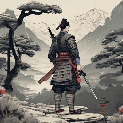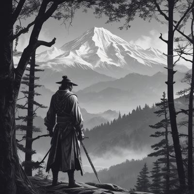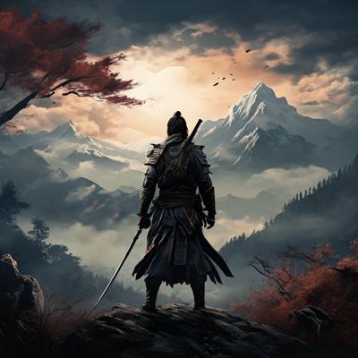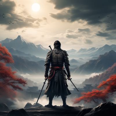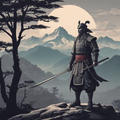 Самурай стоит на фоне гор и деревьев, держа меч.
