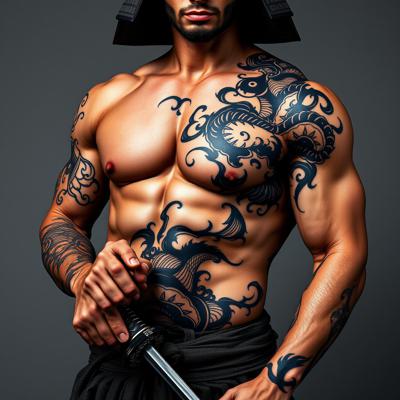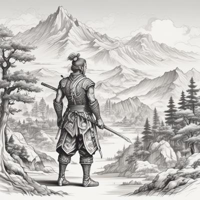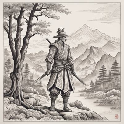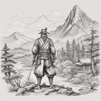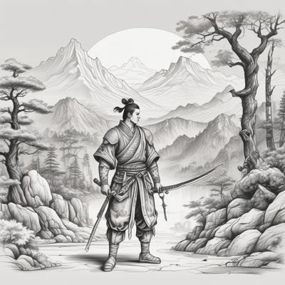 Эскиз тату в китайском стиле , Самурай стоит на фоне гор и деревьев, держа меч.