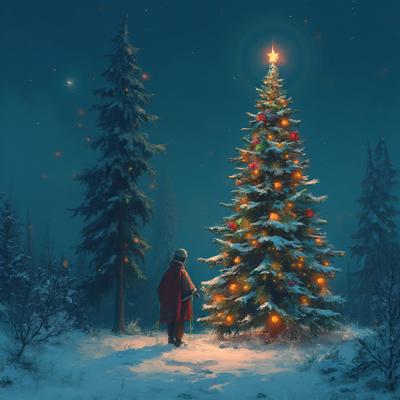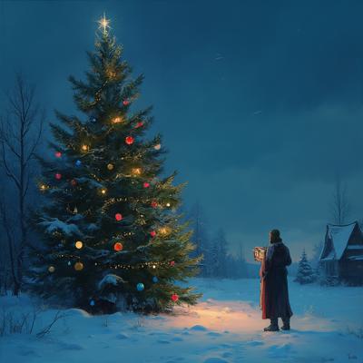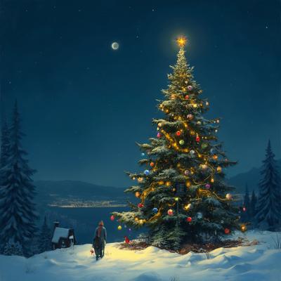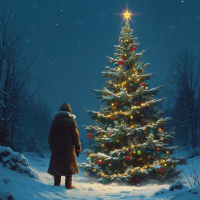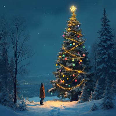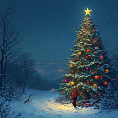 Зимняя ясная ночь, высокая ель украшена разноцветными шариками и горят гирлянды, на макушке ёлка, я стою возле ели
