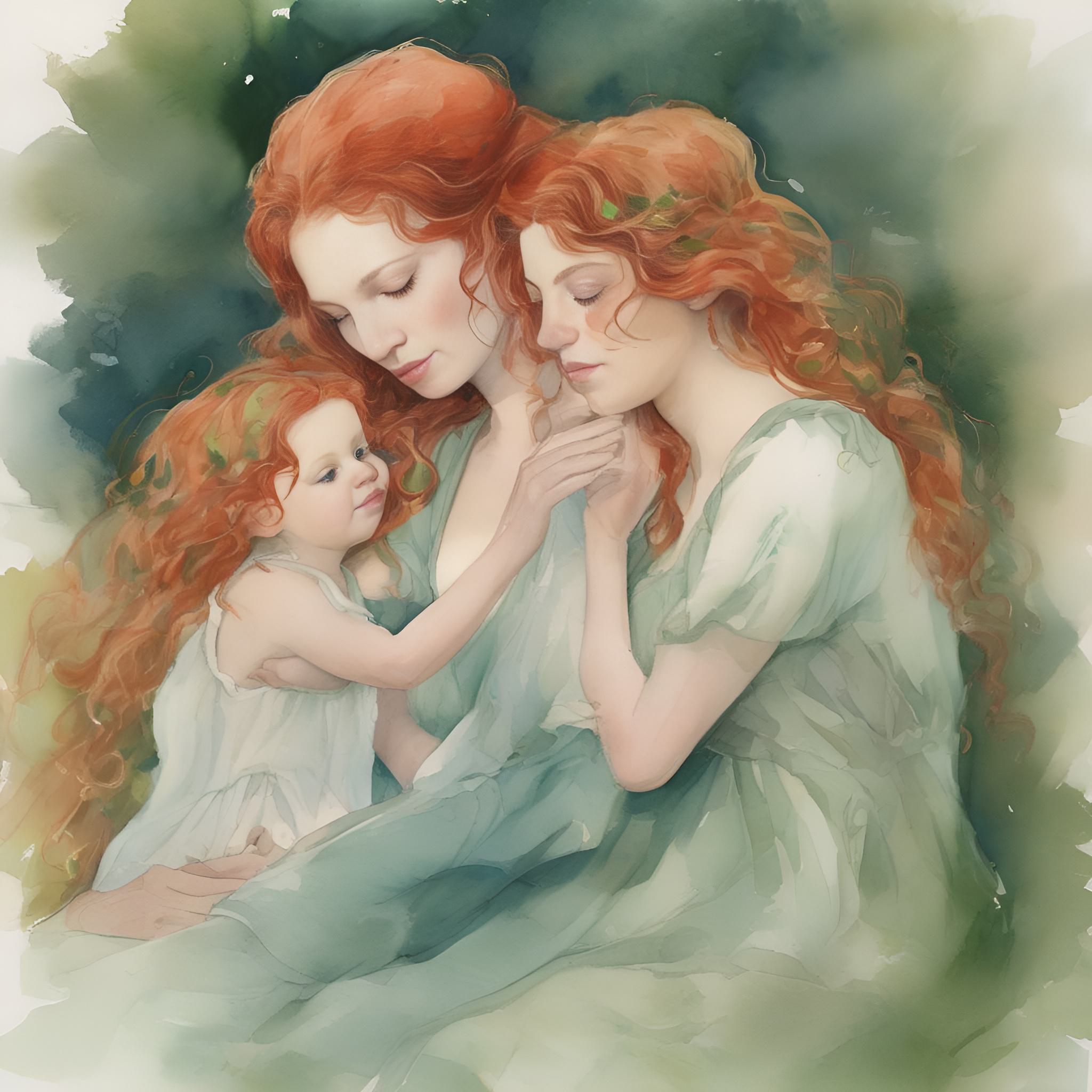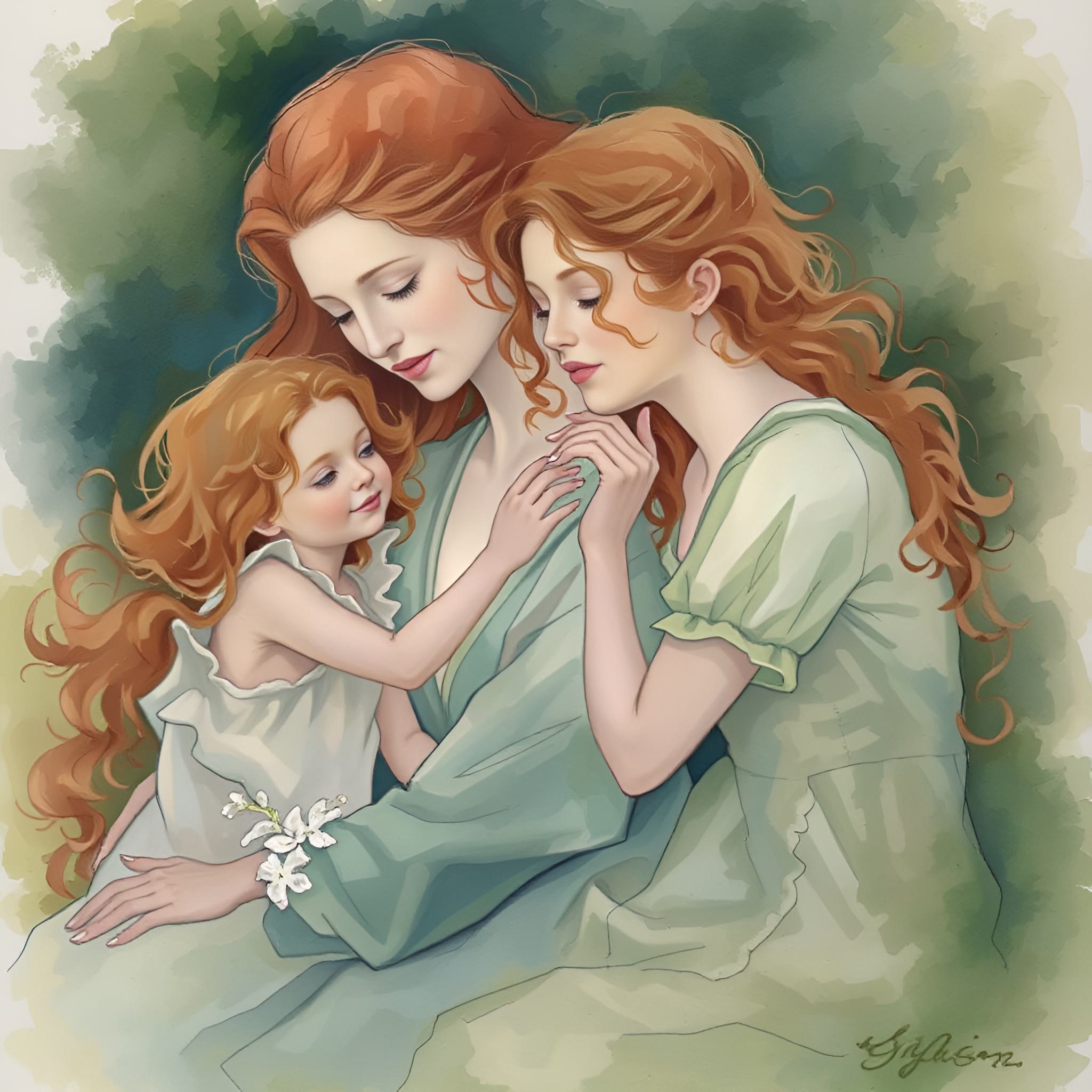 Мама с рыжими волосами и зелеными глазами обнимает двух дочек 3 года и 9 лет с рыжими волосами и синими глазами. Техника акварель, нежные тона [Улучшение лиц + качество x2 ]