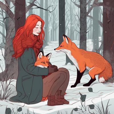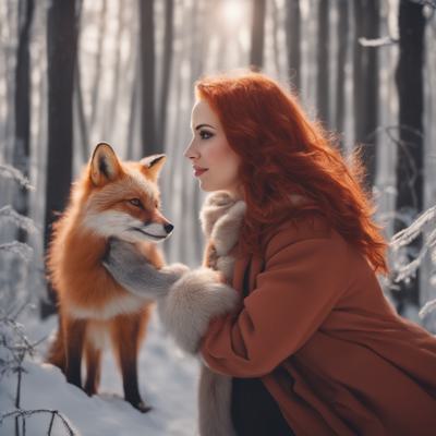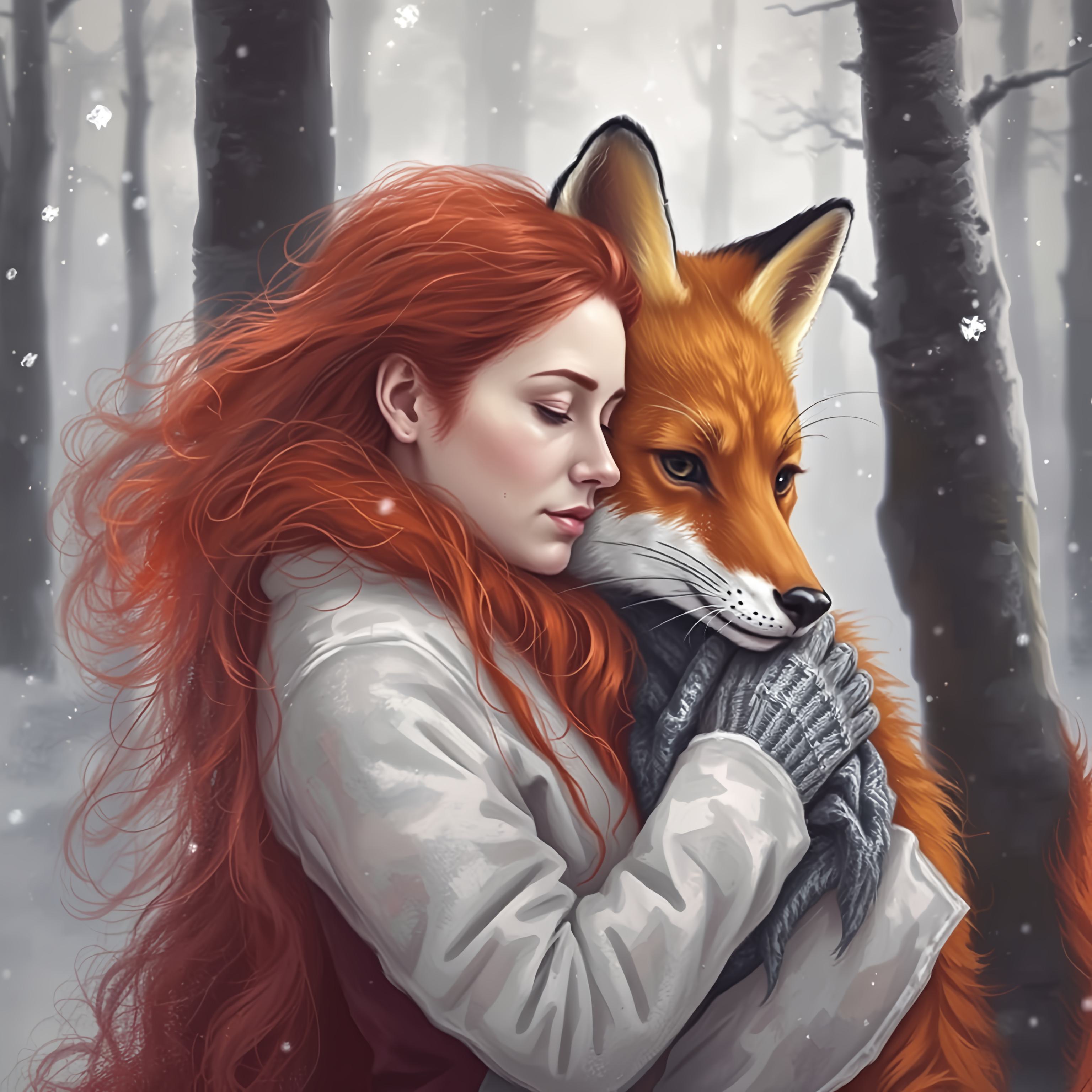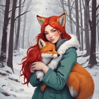 Рыжеволосая девушка зимой в лес обнимает рыжую лису в арт стиле. [Улучшение крупных деталей ]