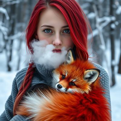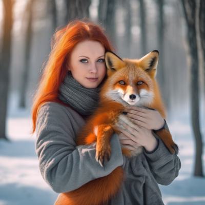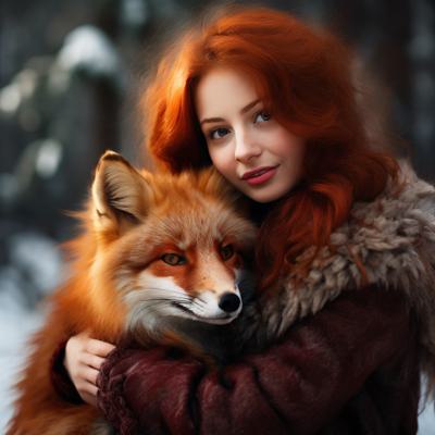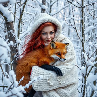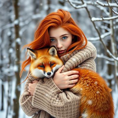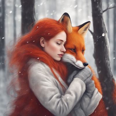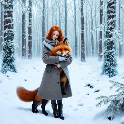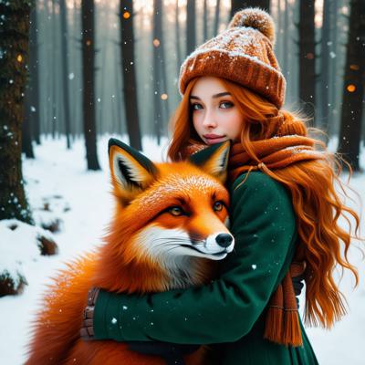 Рыжеволосая девушка зимой в лес обнимает рыжую лису в арт стиле. [Улучшение лиц + качество x2 ]