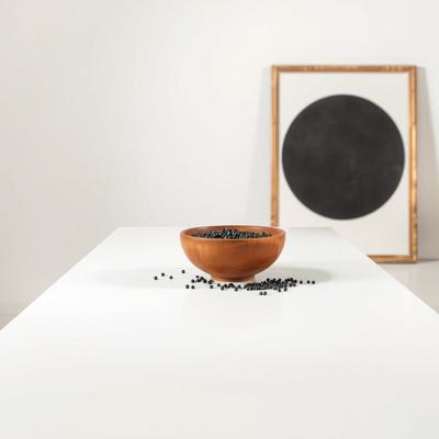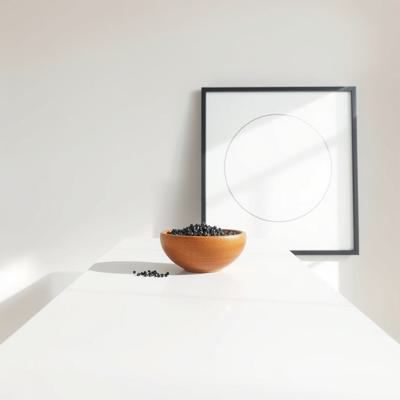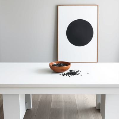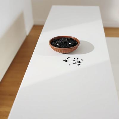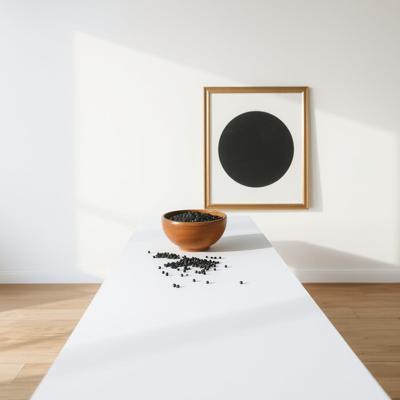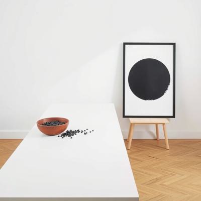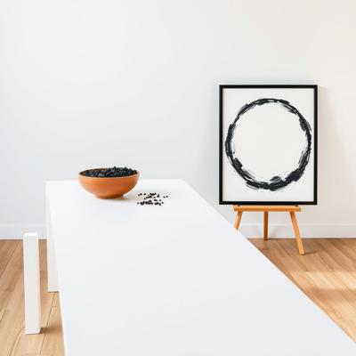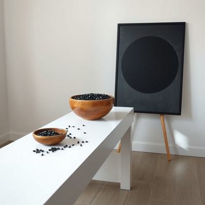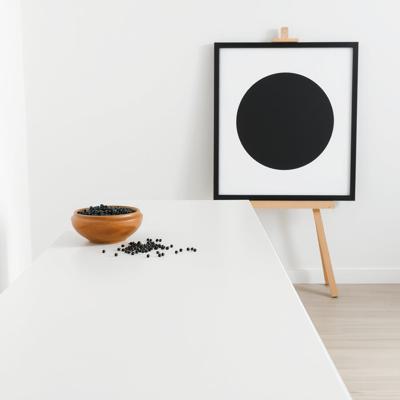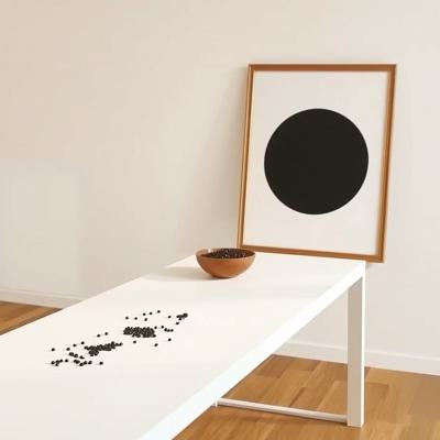 Длинный белый пустой стол стоит по диагонали к камере. На столе стоит керамическая коричневая миска, наполненная черными пайетками, немножко пайеток разбросано по столу. Рядом с миской на столе стоит большая картина в рамке (в 5 раз больше миски). На картине нарисован черный круг,