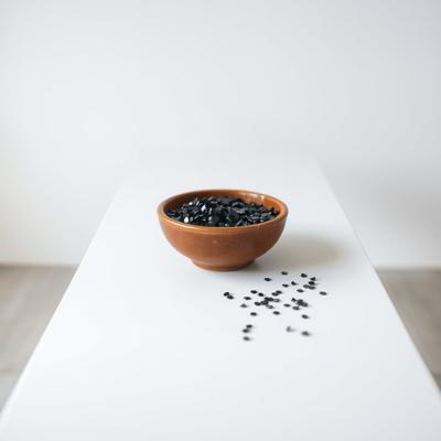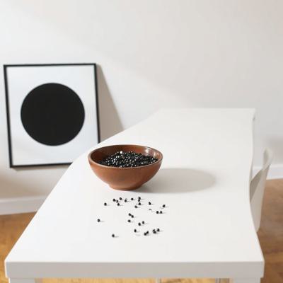 Длинный белый пустой стол стоит по диагонали к камере. На столе стоит керамическая коричневая миска, наполненная черными пайетками, немножко пайеток разбросано рядом с ней на столе. Атмосфера праздника и волшебства,