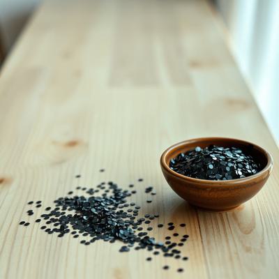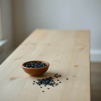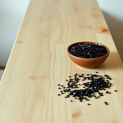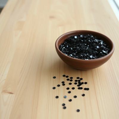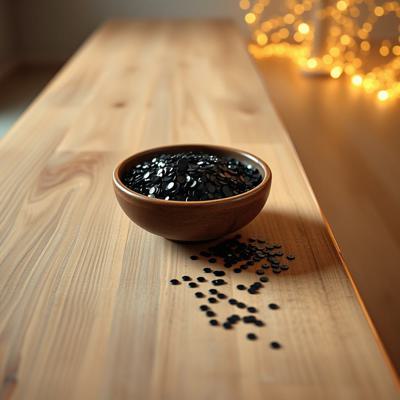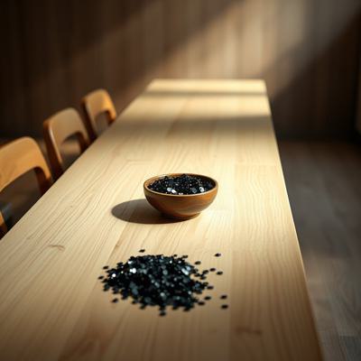 Длинный светло деревянный пустой стол стоит по диагонали к камере из верхнего правого угла изображения в нижний левый угол. На столе стоит фарфоровая коричневая миска, наполненная черными пайетками, немножко пайеток разбросано рядом с ней на столе. Атмосфера праздника и волшебства,