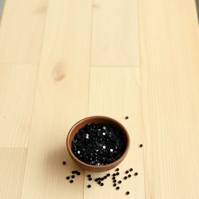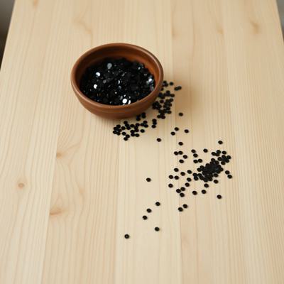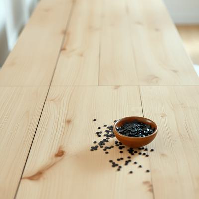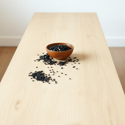 Длинный светло деревянный пустой стол стоит по диагонали к камере. На столе стоит фарфоровая коричневая миска, наполненная черными пайетками, немножко пайеток разбросано рядом с ней на столе. Атмосфера праздника и волшебства, [Вариации для #6298618 ]
