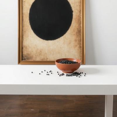 Длинный белый пустой стол стоит по диагонали к камере. На столе стоит керамическая коричневая миска, наполненная черными пайетками, немножко пайеток разбросано рядом с ней на столе. Рядом с миской на столе стоит большая картина в черной рамке (в 5 раз больше миски). На картине нарисован черный круг,