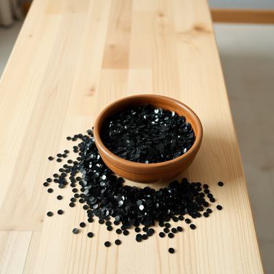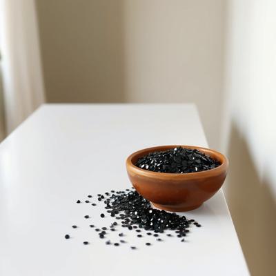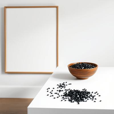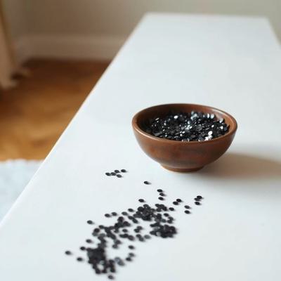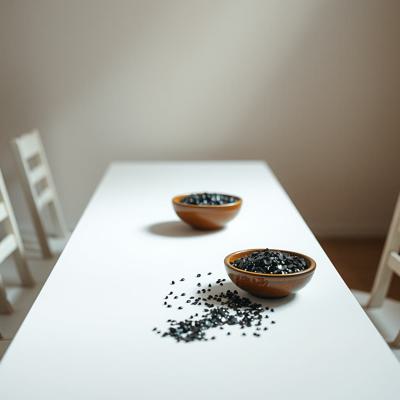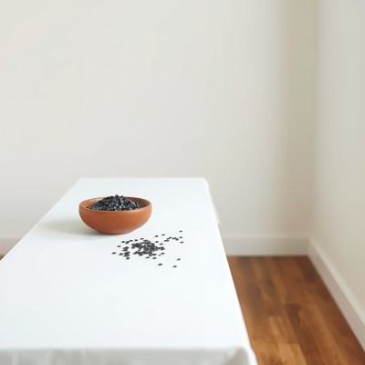[Без фона #6298334 'Длинный белый пустой стол стоит по диагонали к камере. На столе стоит керамическая коричневая миска, наполненная черными пайетками, немножко пайеток разбросано рядом с ней на столе. Атмосфера праздника и волшебства, ]'
