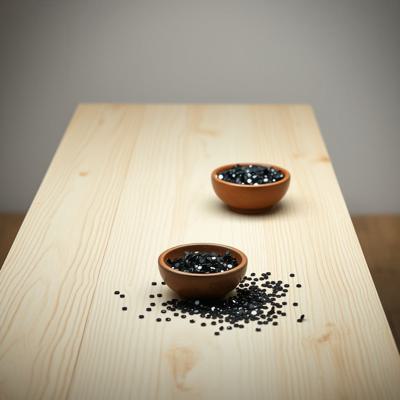 Длинный светло деревянный пустой стол стоит по диагонали к камере. На столе стоит фарфоровая коричневая миска, наполненная черными пайетками, немножко пайеток разбросано рядом с ней на столе. Атмосфера праздника и волшебства,
