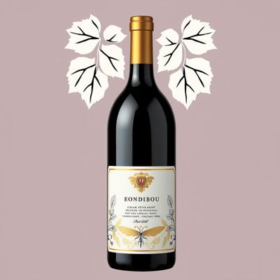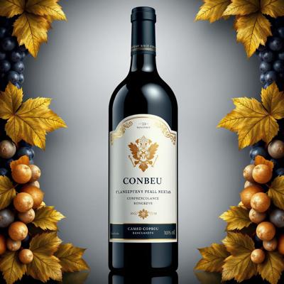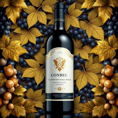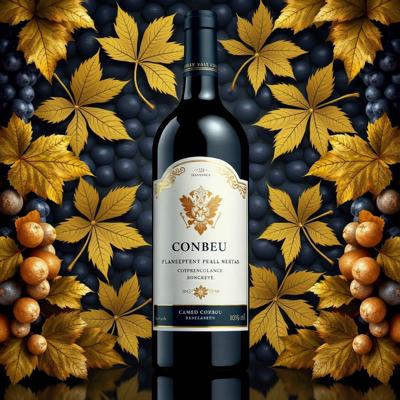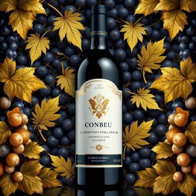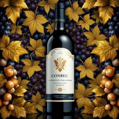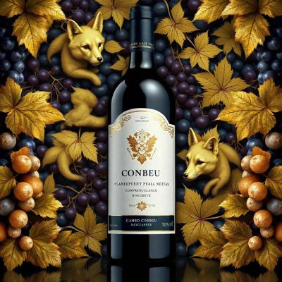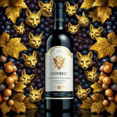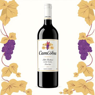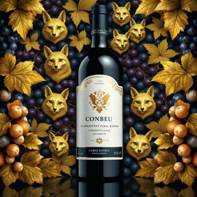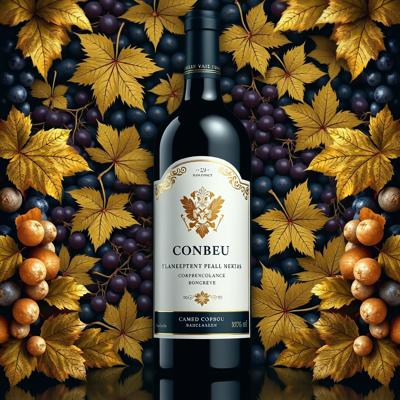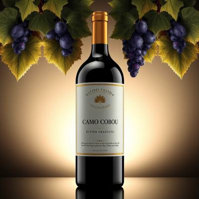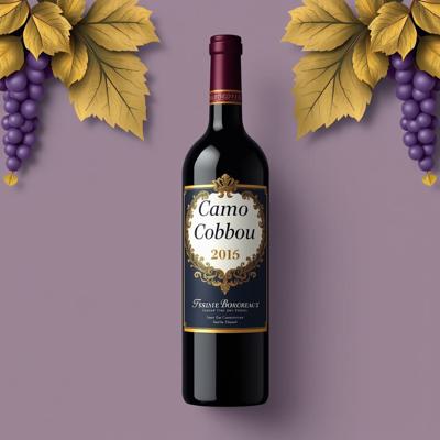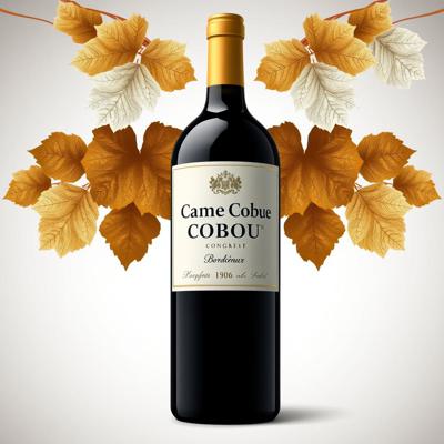 на этикетке раскиданы лисья из золота [Уточнение для #5993227 'листья виноградные размбросаны по фону этикетки , из золота , конгрев , [Уточнение для #5993215 ' винная бутылка. форма бордо. этикетка содержит фон, виноградные листья, в верхней и нижней части этикетки, выполненных золотым и белым конгревом. в центре этикетки бренд CAMO COBOU ]']'