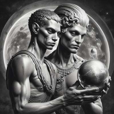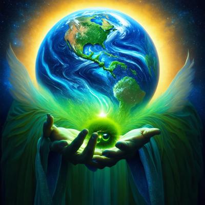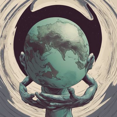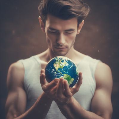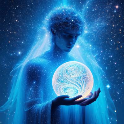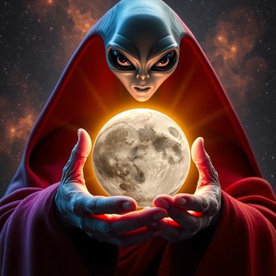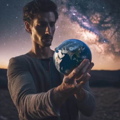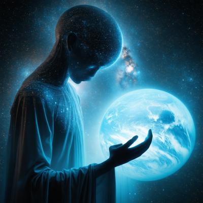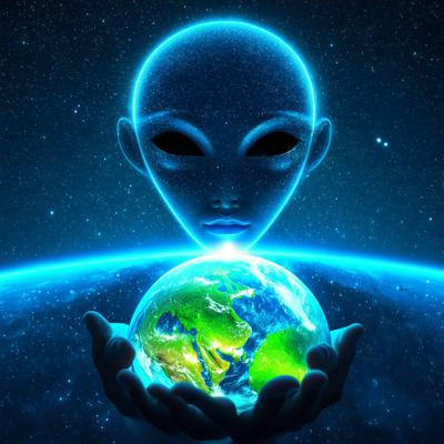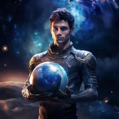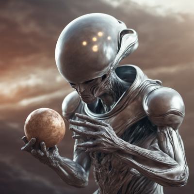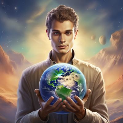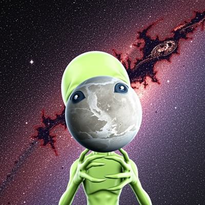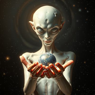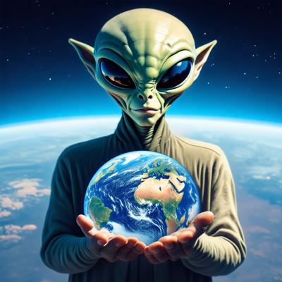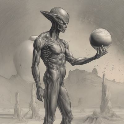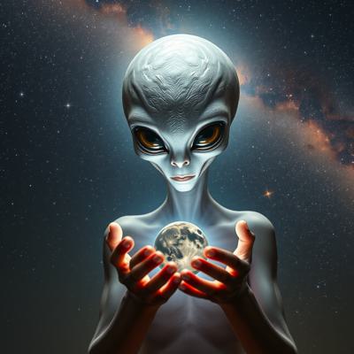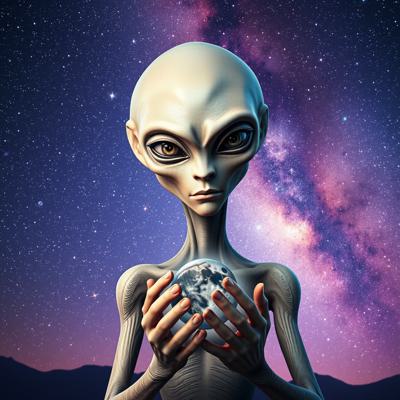 красивый добрый инопланетятин в руках держит планету меркурий над ним млечный путь звездный