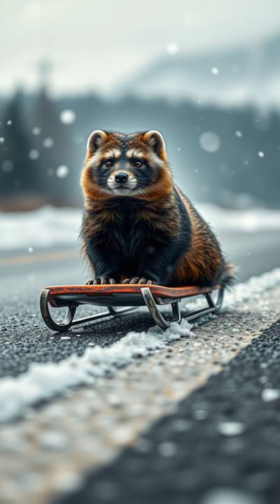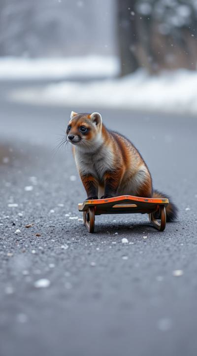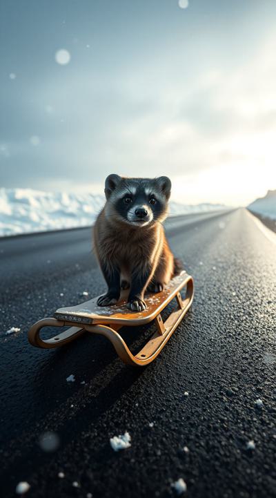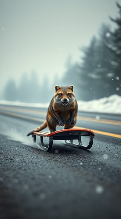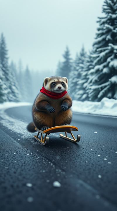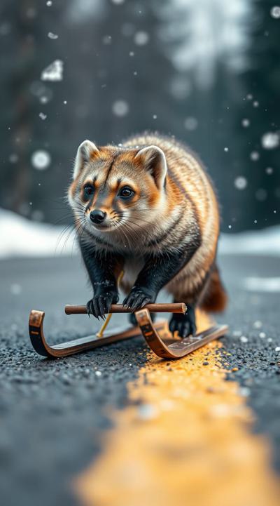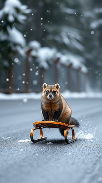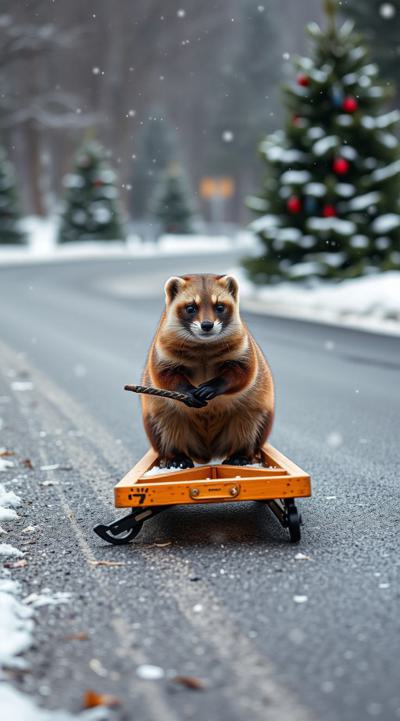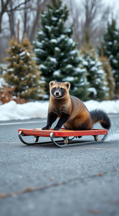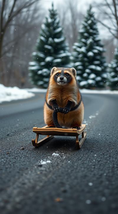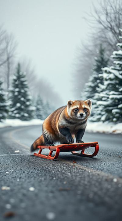 Куница едет на санках по асфальту, падают снежинки чуть-чуть, асфальт сухой, на фоне не должно быть снега, елки сухие
