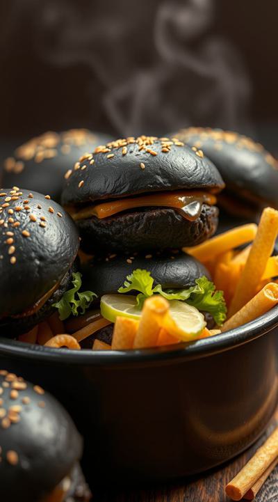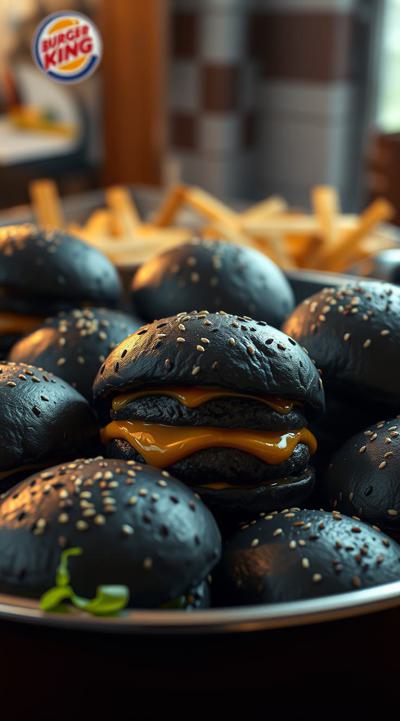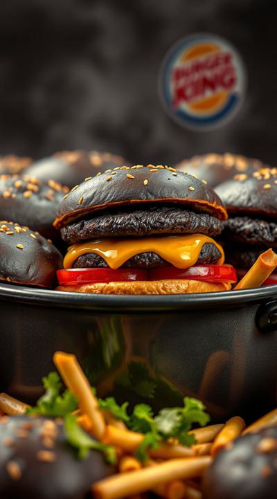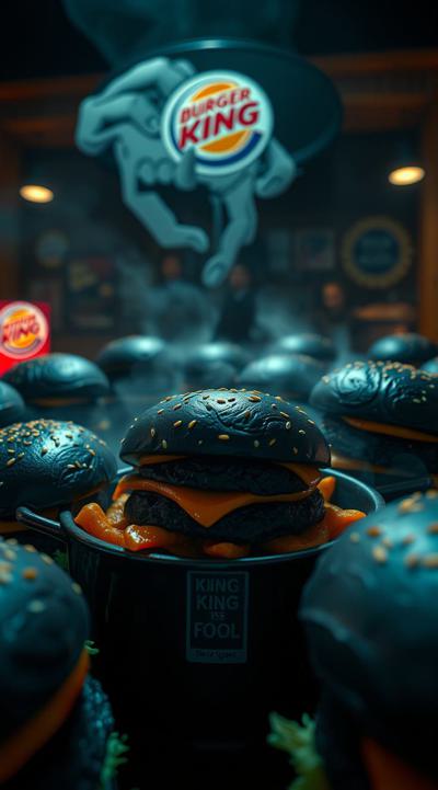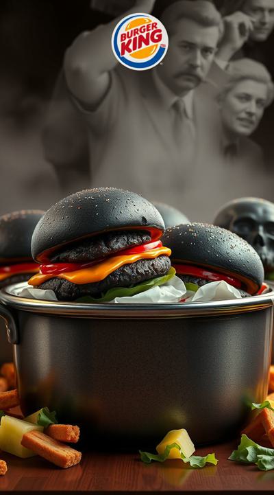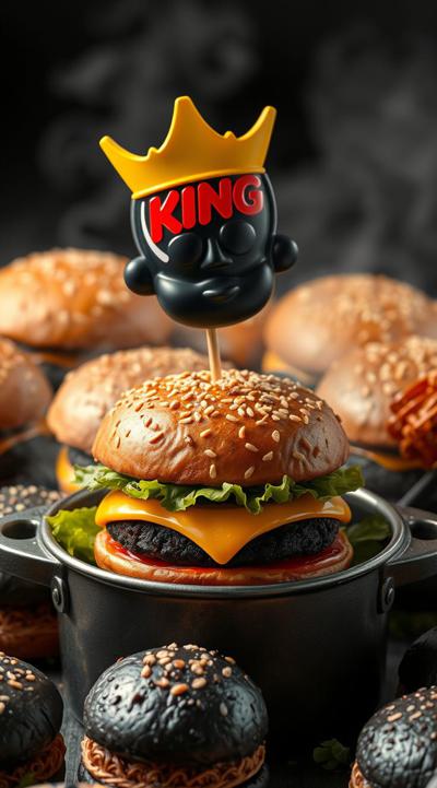 черные бургеры, много, в горшке они набиты , Это коллаба бургер Кинга и король и шут