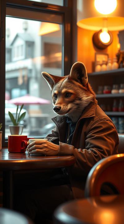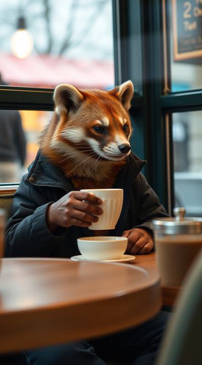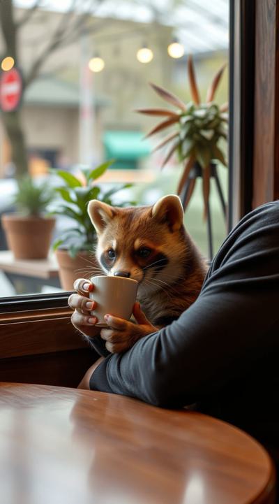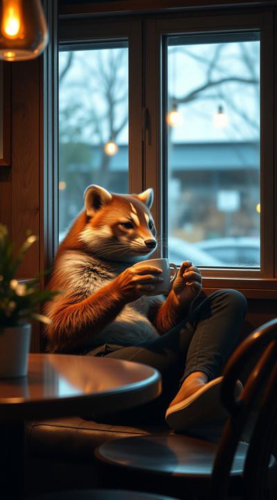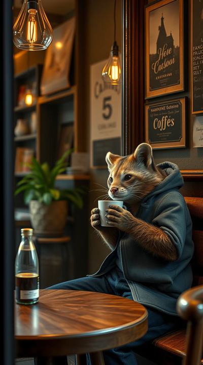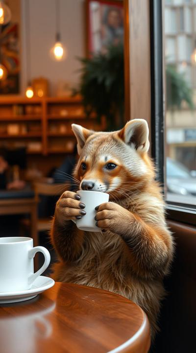 Куница сидит и пьет кофе в уютной кофейне