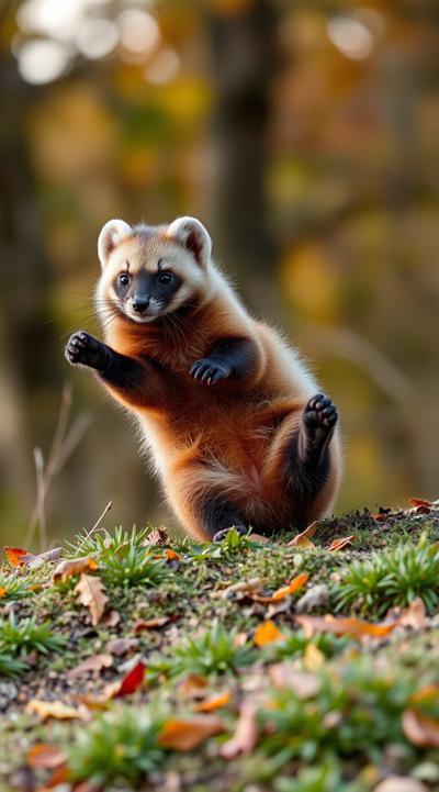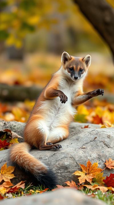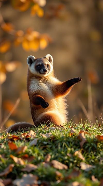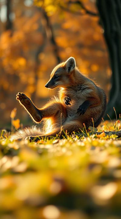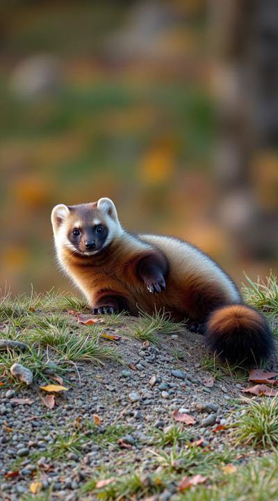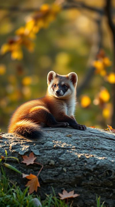 кайфующая куница во время бабьего лета, осень на фоне, лежит отдыхает она