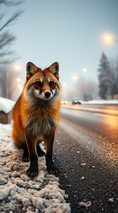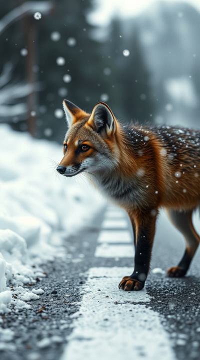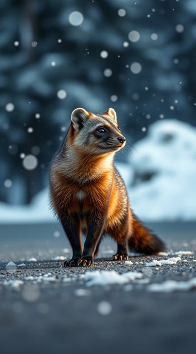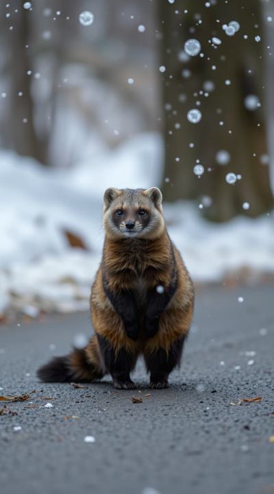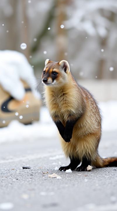 Куница стоит на улице, падают снежинки, но асфальт сухой