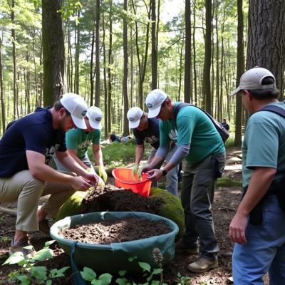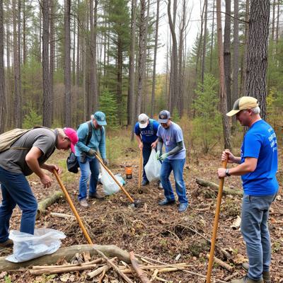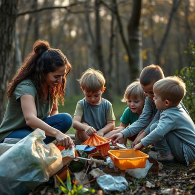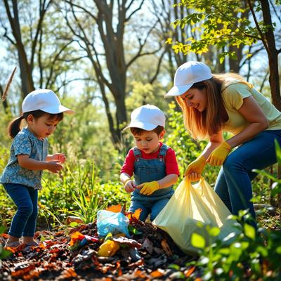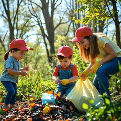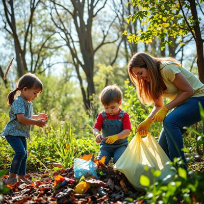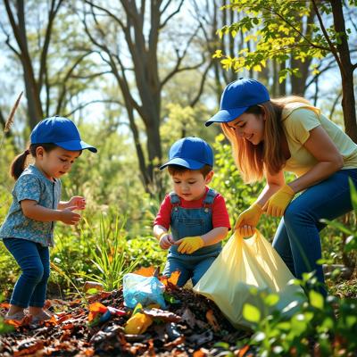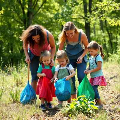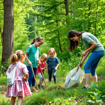 родители с детьми на природе, убирают мусор вместе, волонтерство
