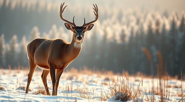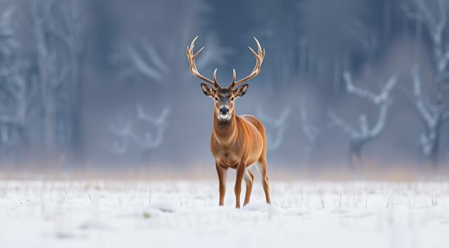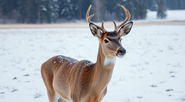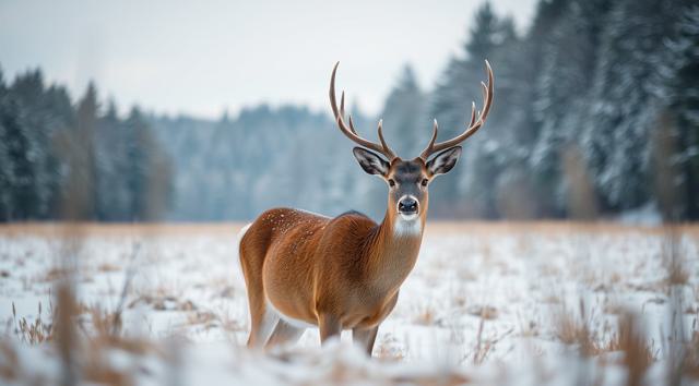 олень в снежном поле смотрит на зрителя, на заднем плане лес