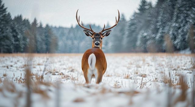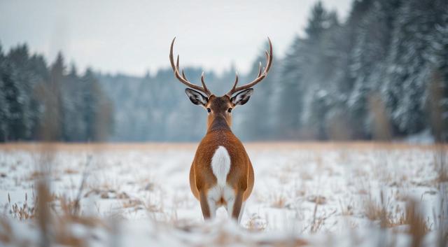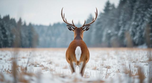 олень стоит спиной к зрителю, его видно полностью [Уточнение для #6133181 'олень в снежном поле смотрит на зрителя, на заднем плане лес ]'