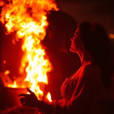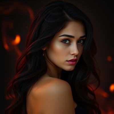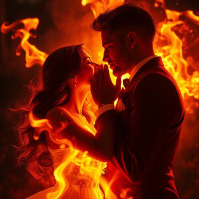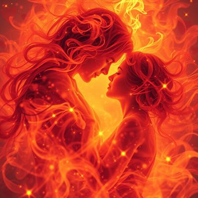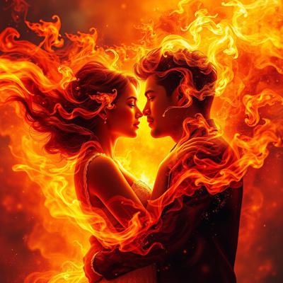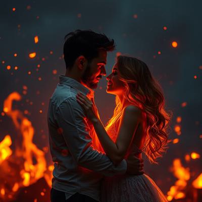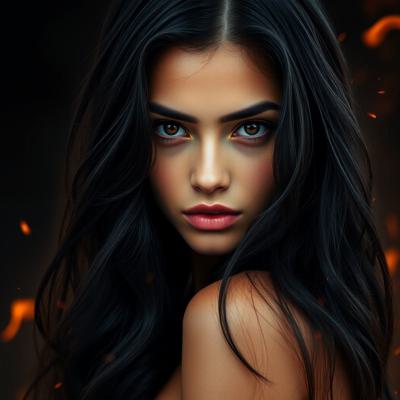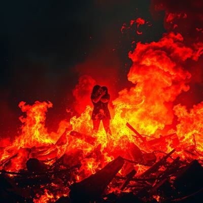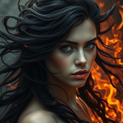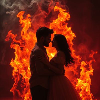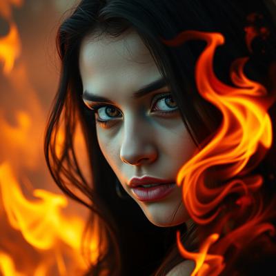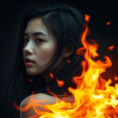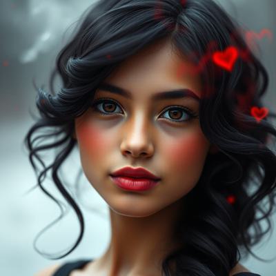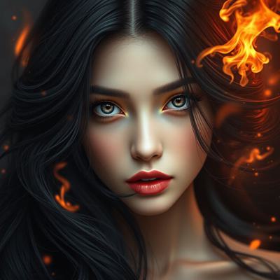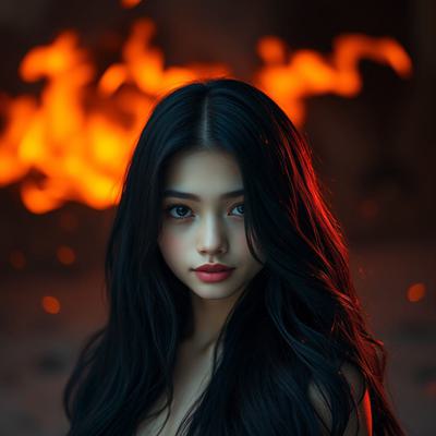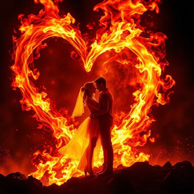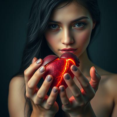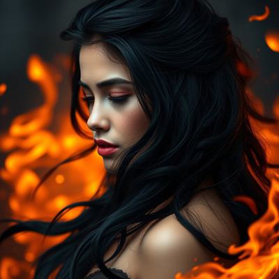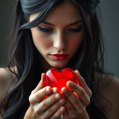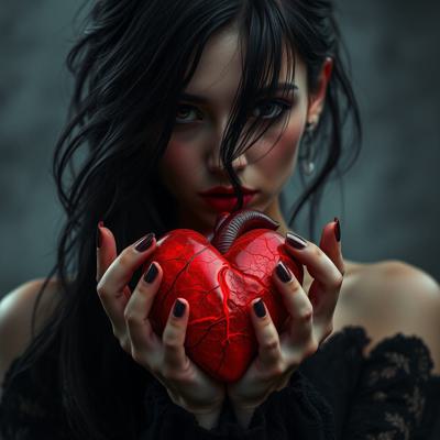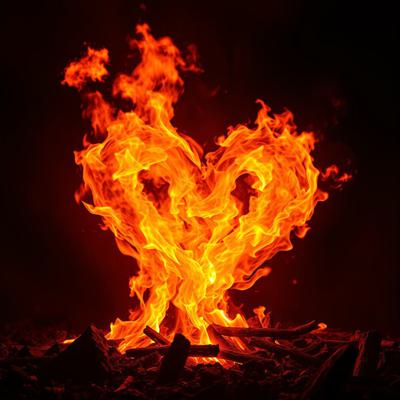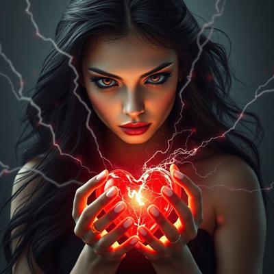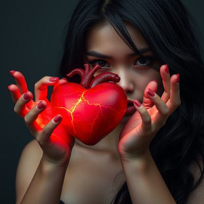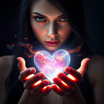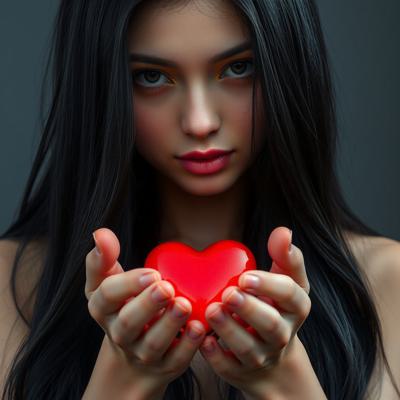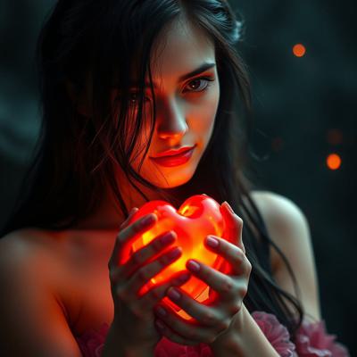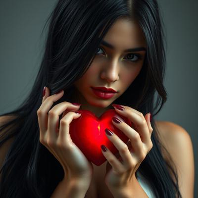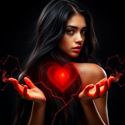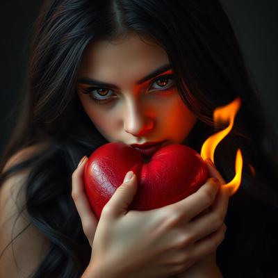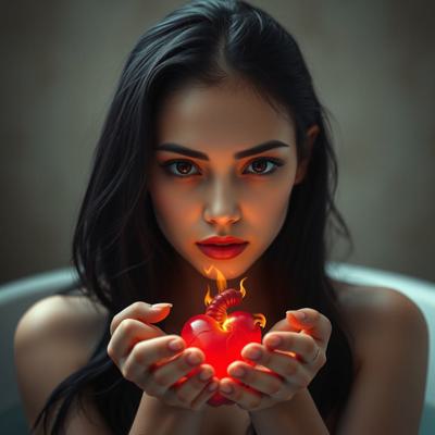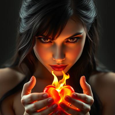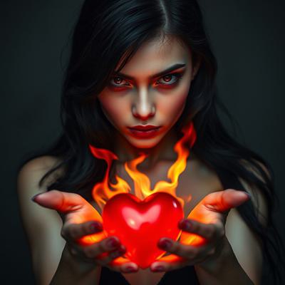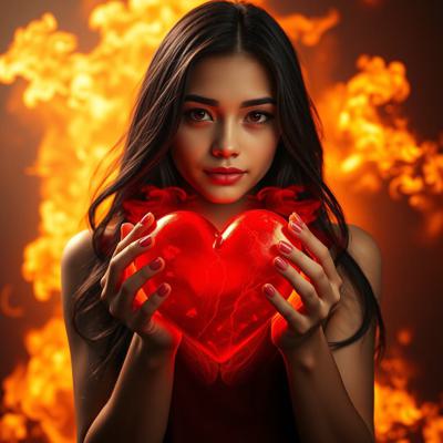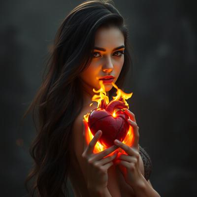 девушка с черными волосами с сердечком в руках а в сердце горит огонь