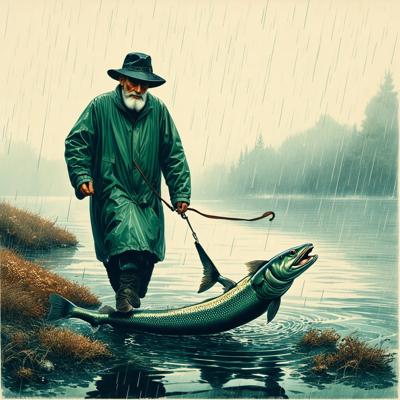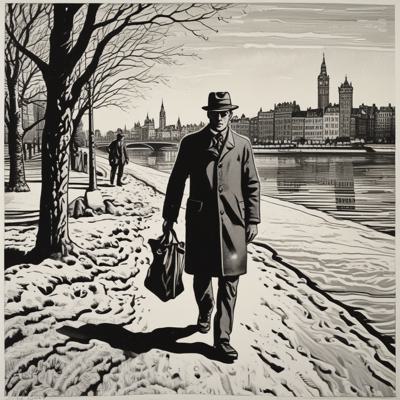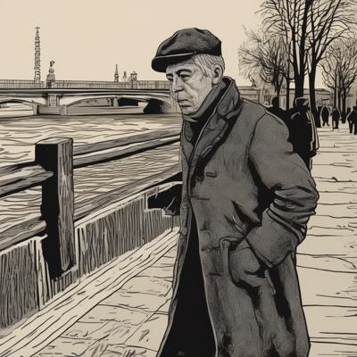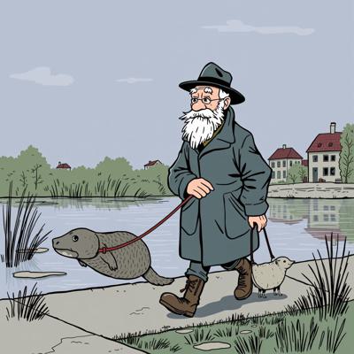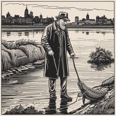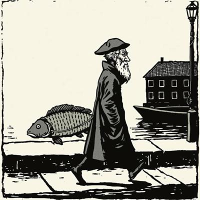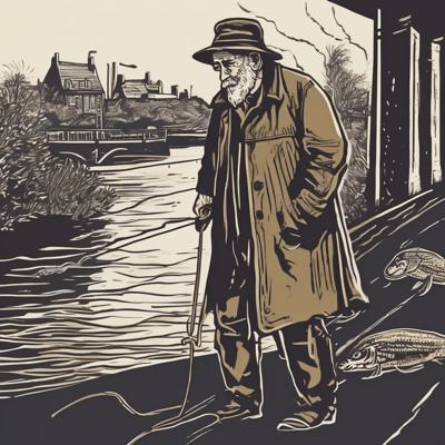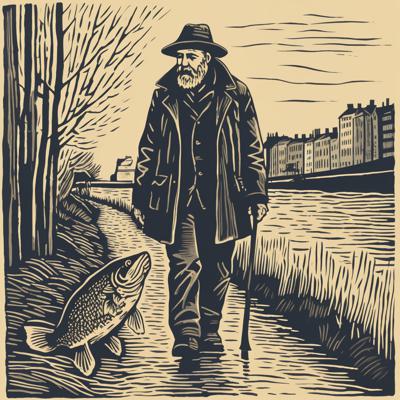 Низкий бородатый дедушка в шляпе и плаще выгуливает налима на поводке по набережной, простая линогравюра