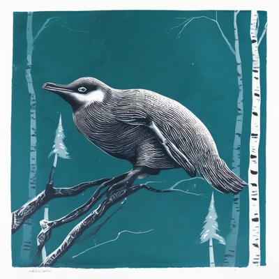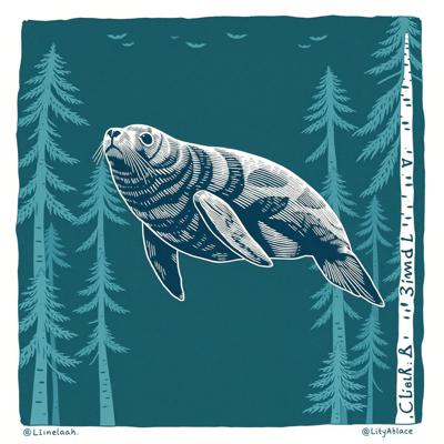 Нерпа плывет над лесом, линогравюра