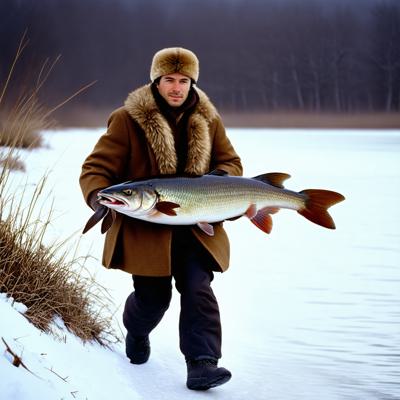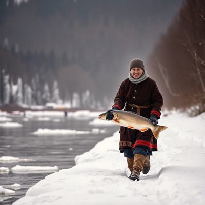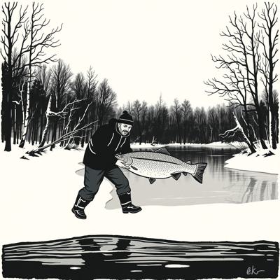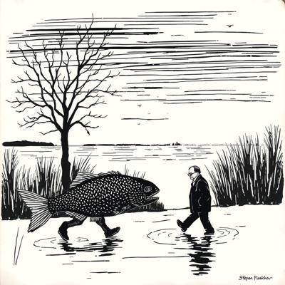 Степан Писахов выгуливает налима по набережной, простая линогравюра
