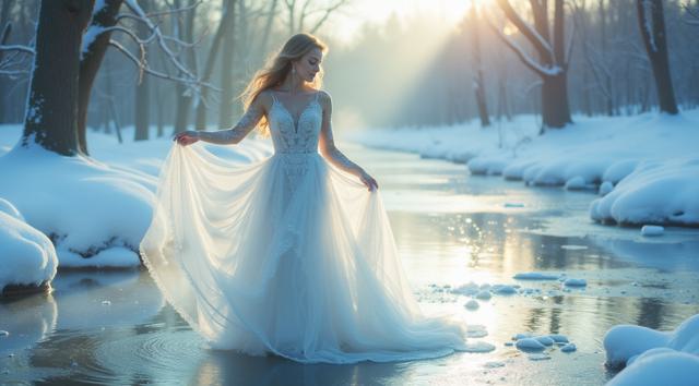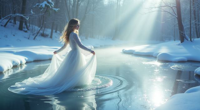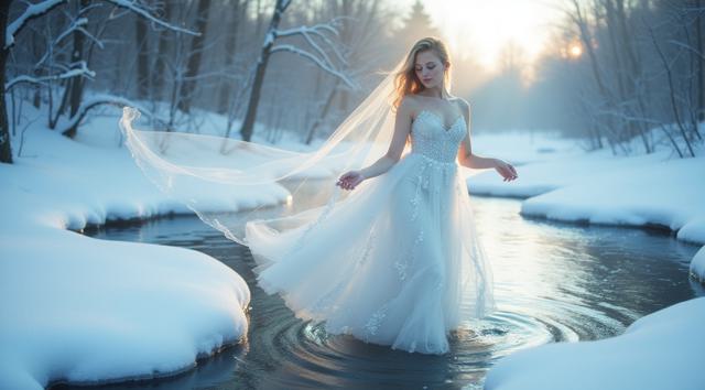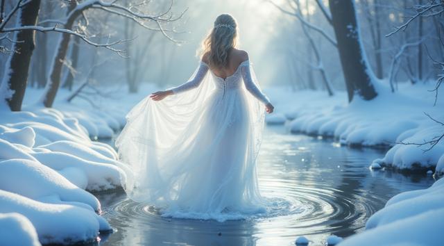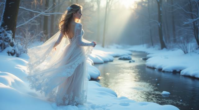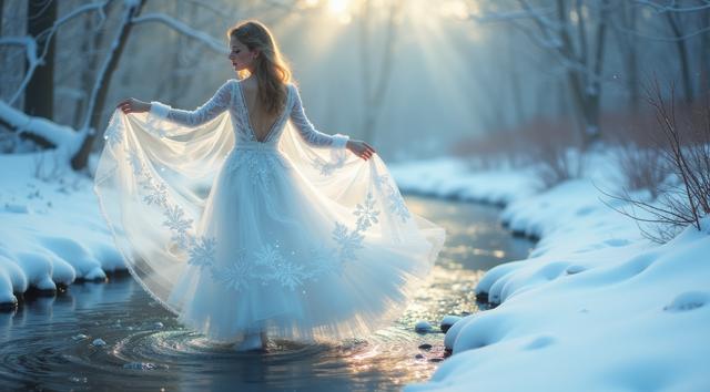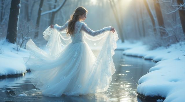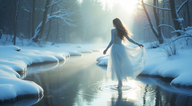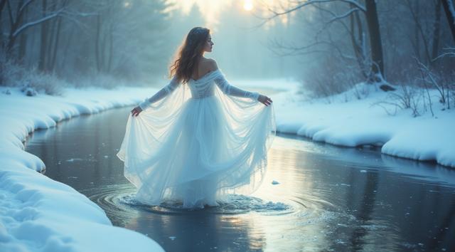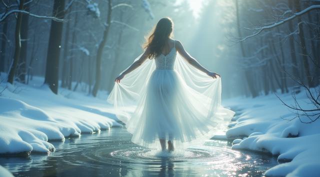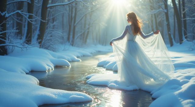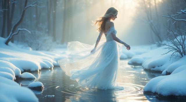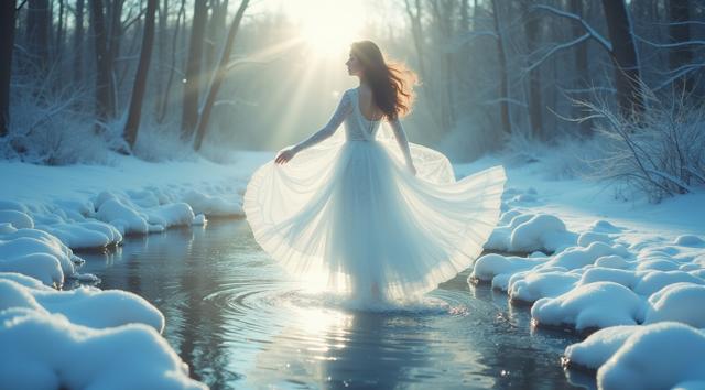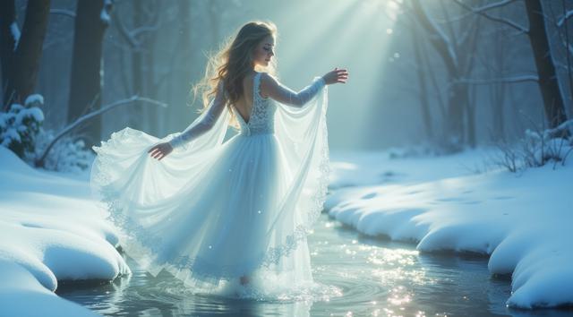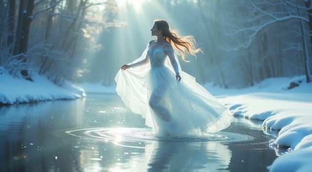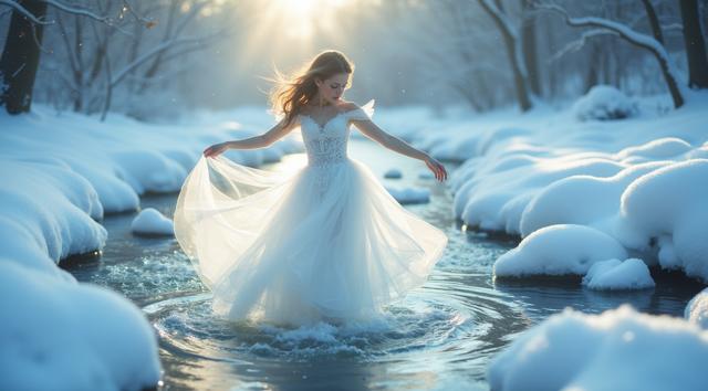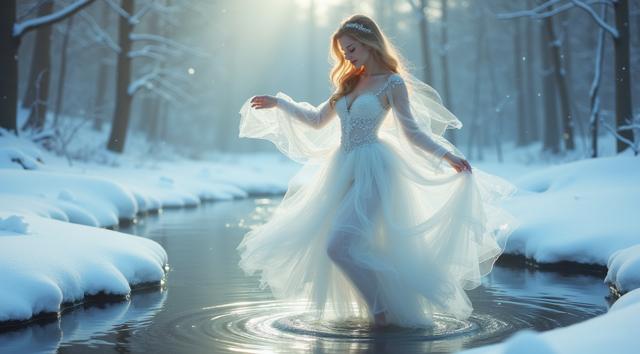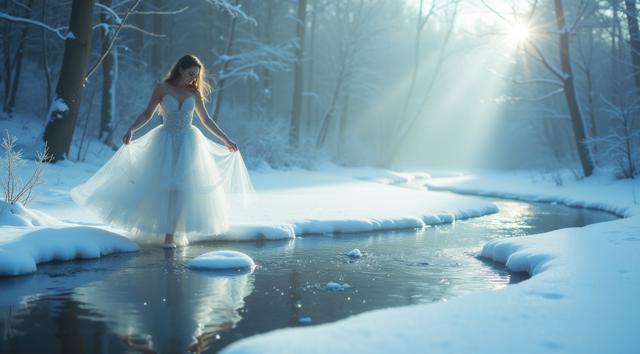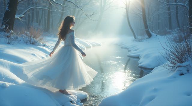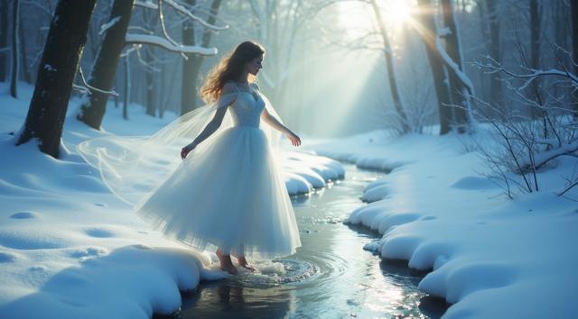 In a serene winter scene, a delicate snow fairy dances at a frozen brook's edge, her frosted gown shimmering, mirroring the brook's icy curves. Against a hushed snowy landscape, she moves with graceful poise, embodying a tranquil winter wonderland. Camera shifts angle after two seconds, showcasing her elegant dance. Close-up, medium shot.