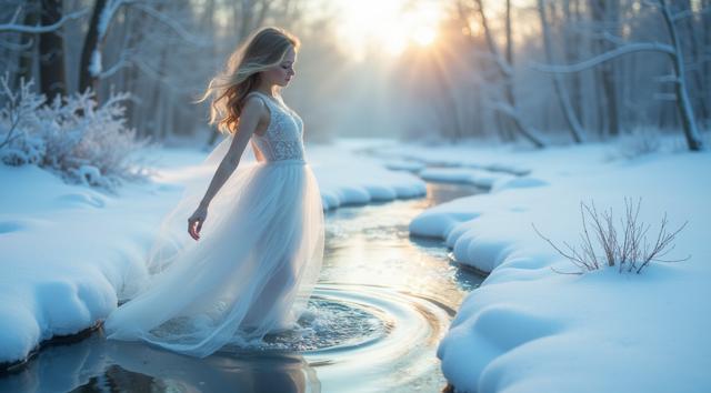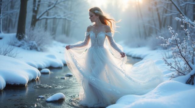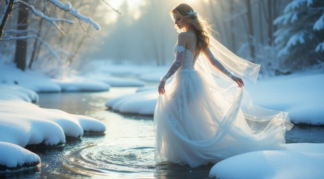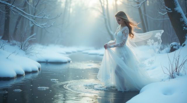 A delicate snow fairy in an ethereal gown dances at the frozen source of a tranquil brook amidst a serene winter wonderland surrounded by soft winter tones and snow-covered banks, conveying effortless elegance and poise, with frost-like intricacy in her shimmering gown and a sense of gentle tranquility.,