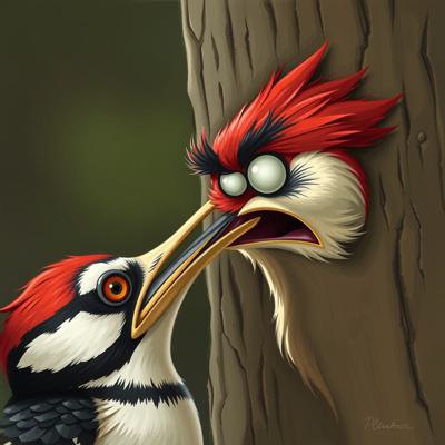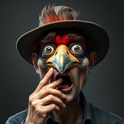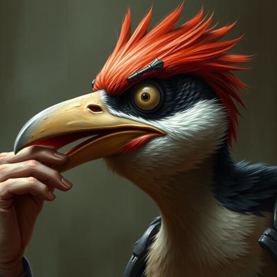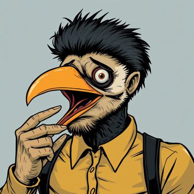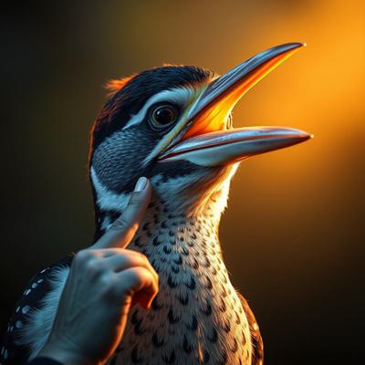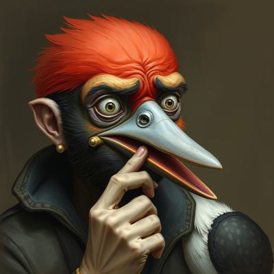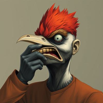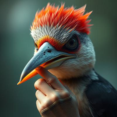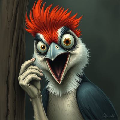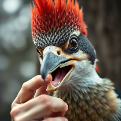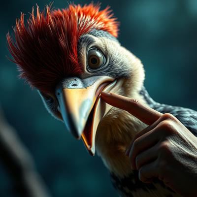 парень, у которого голова человека с клювом дятла трогает свой клюв и глаза испуганные