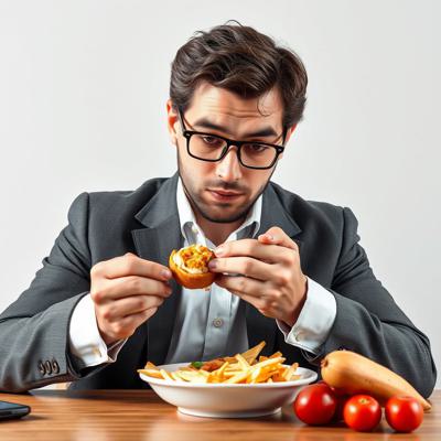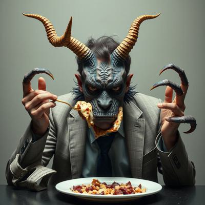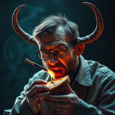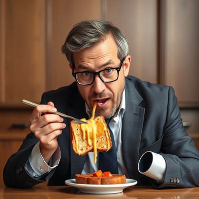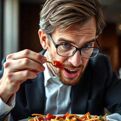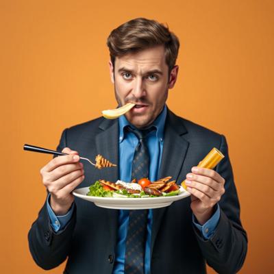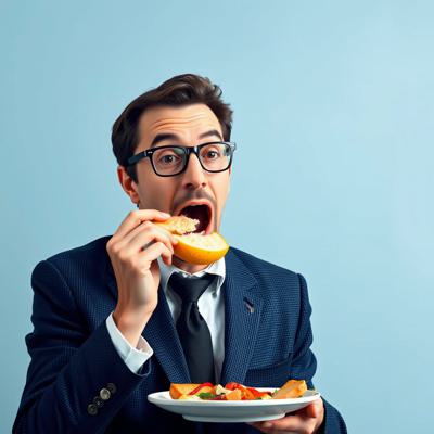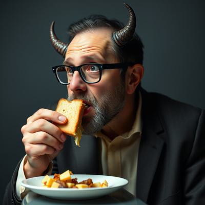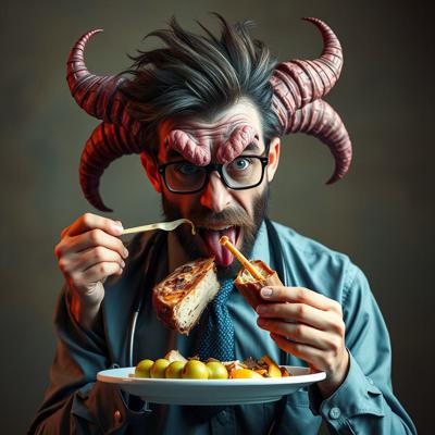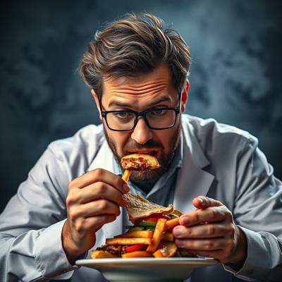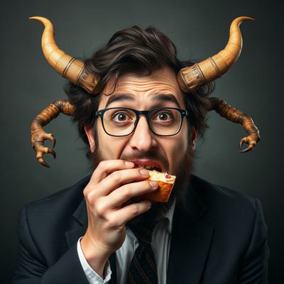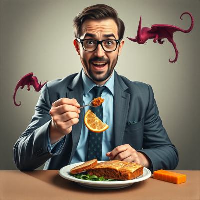 нарисуй картинку эксперт ест свой синдром самозванца. добавь подпись чтобы было понятно что он не просто ест еду