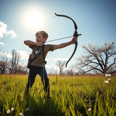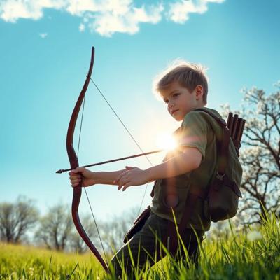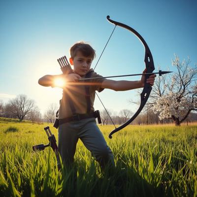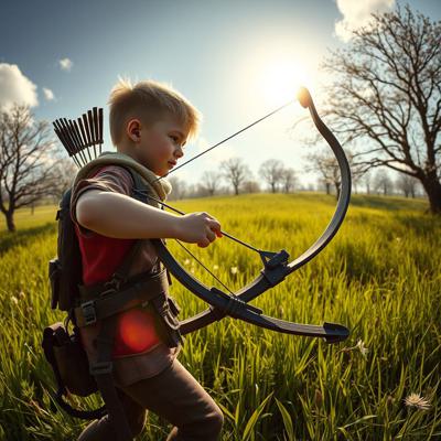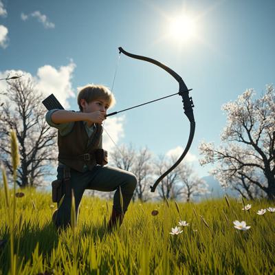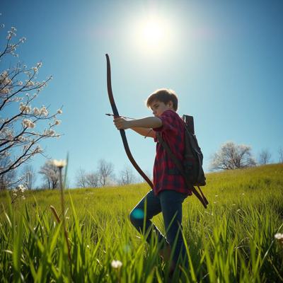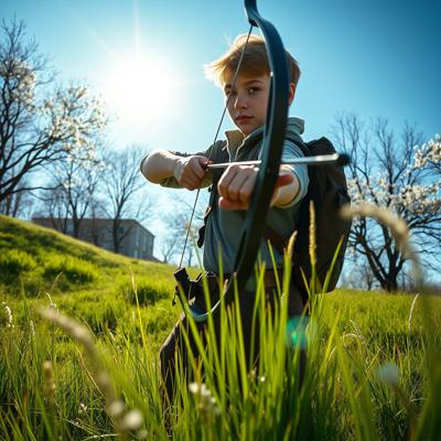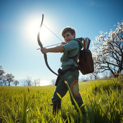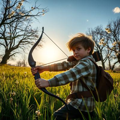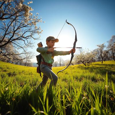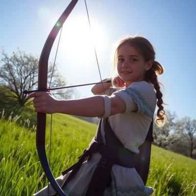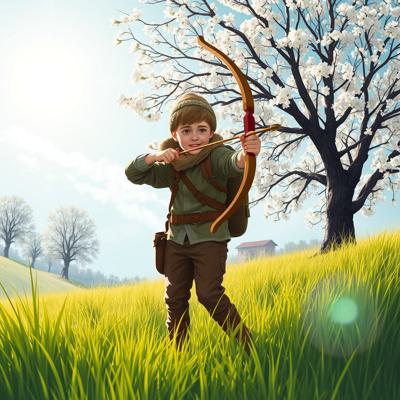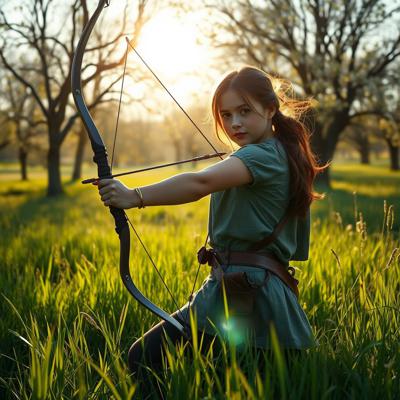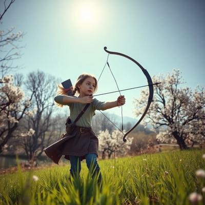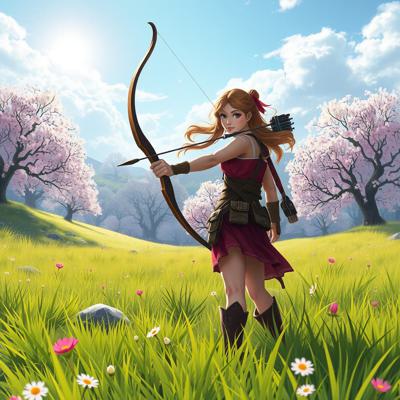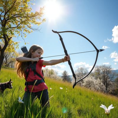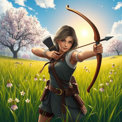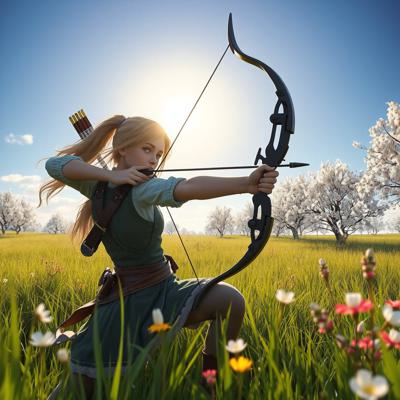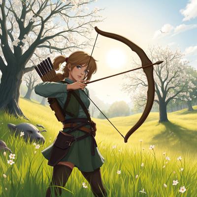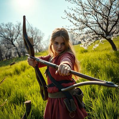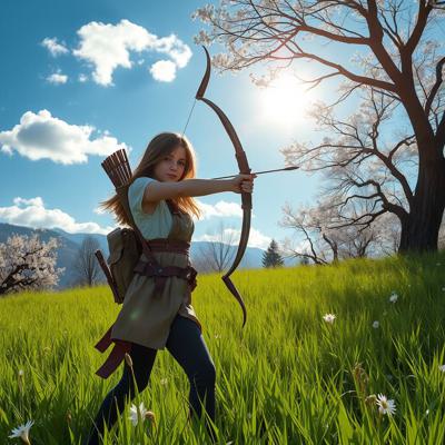 создать вариации молодая охотница с луком или арбалетом в весеннем пейзаже, светит солнце, зелень травы и цветущие деревья голубое небо, солнце Легкая дымка