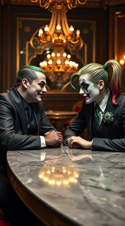 харли квинн и джокер сидят за столом в казино, между ними происходит разговор в стиле мистер и миссис смит [Вариации для #6001588 ]