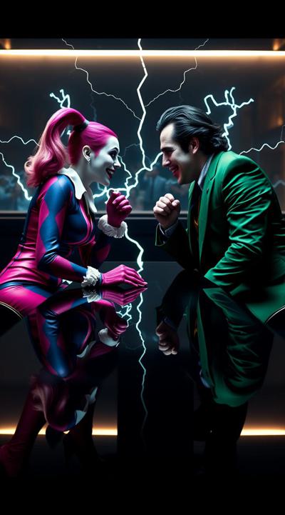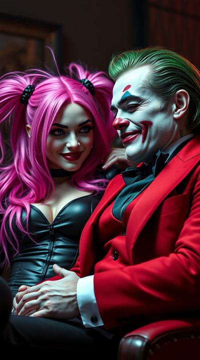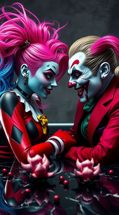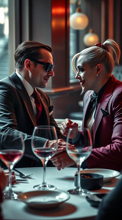 харли квинн и джокер сидят за столом, между ними происходит разговор в стиле мистер и миссис смит [Вариации для #6001579 ]